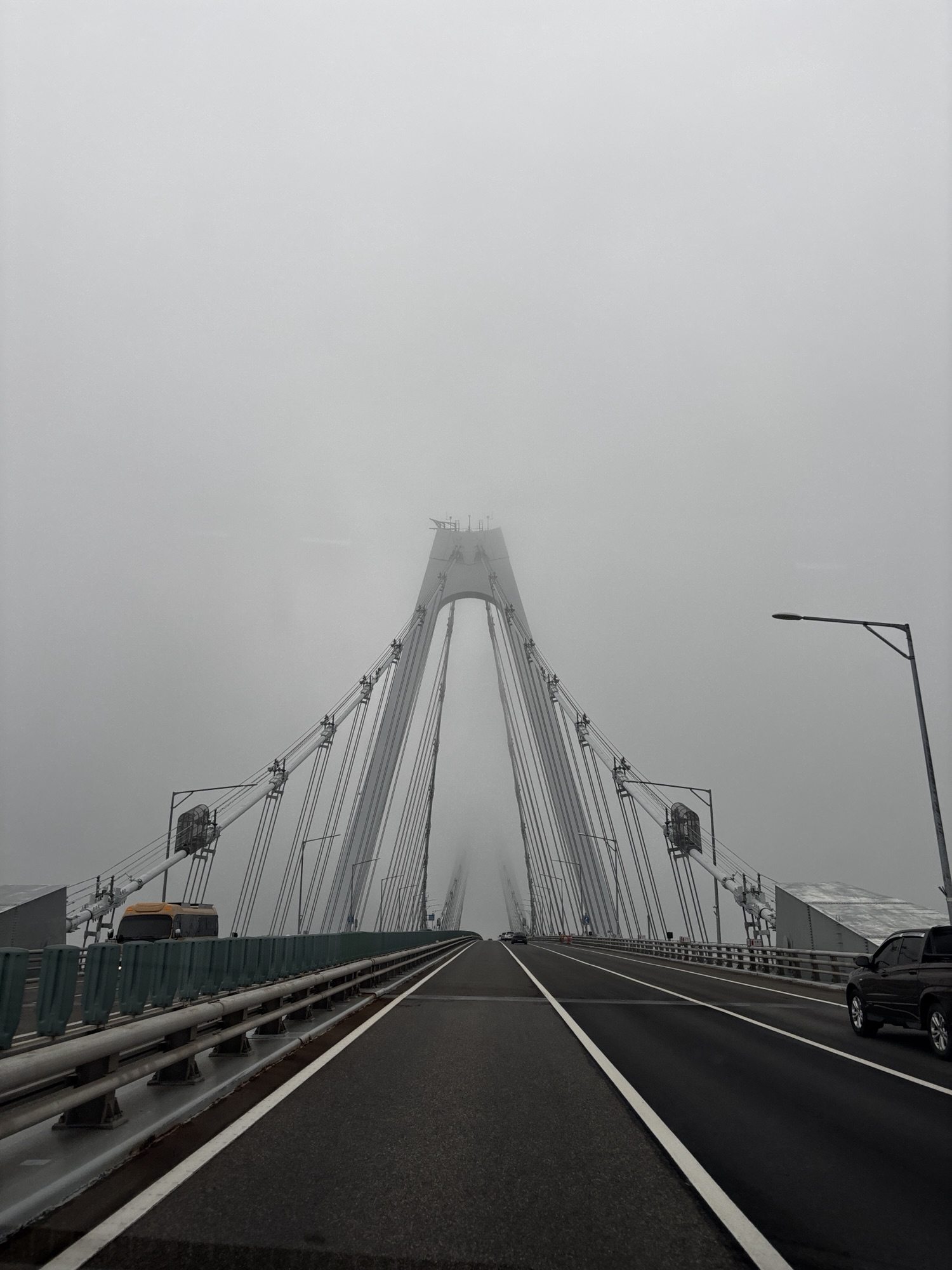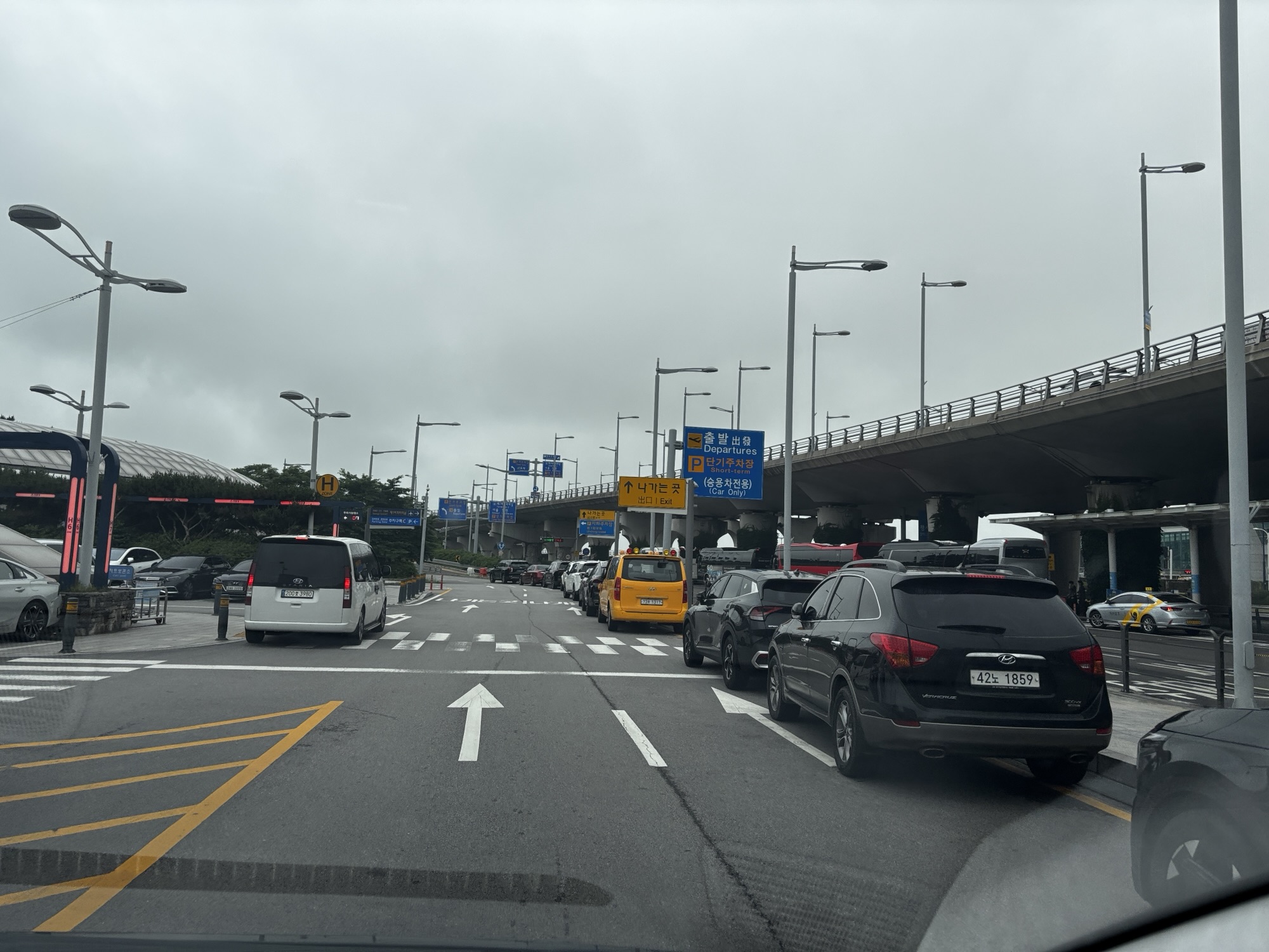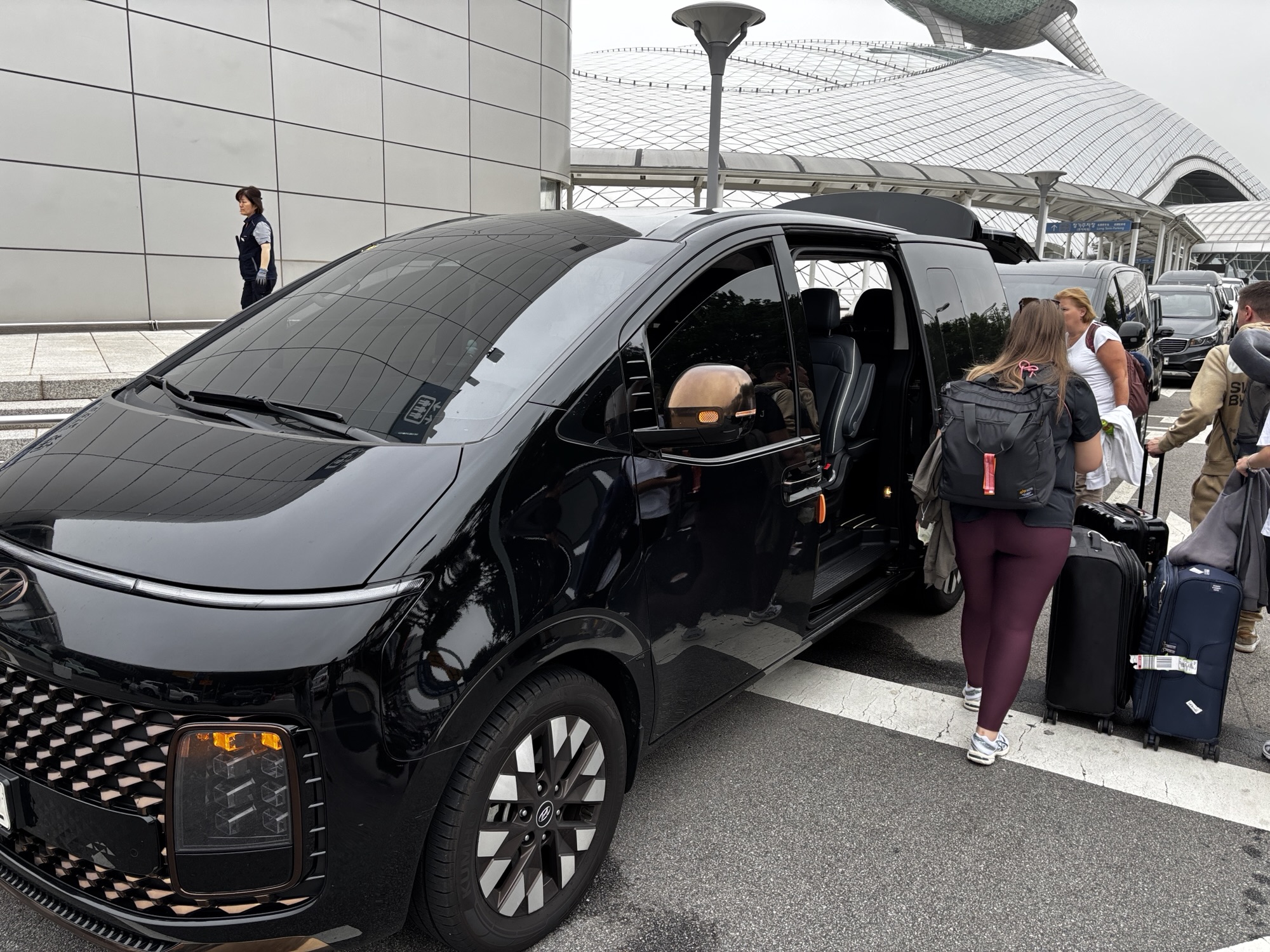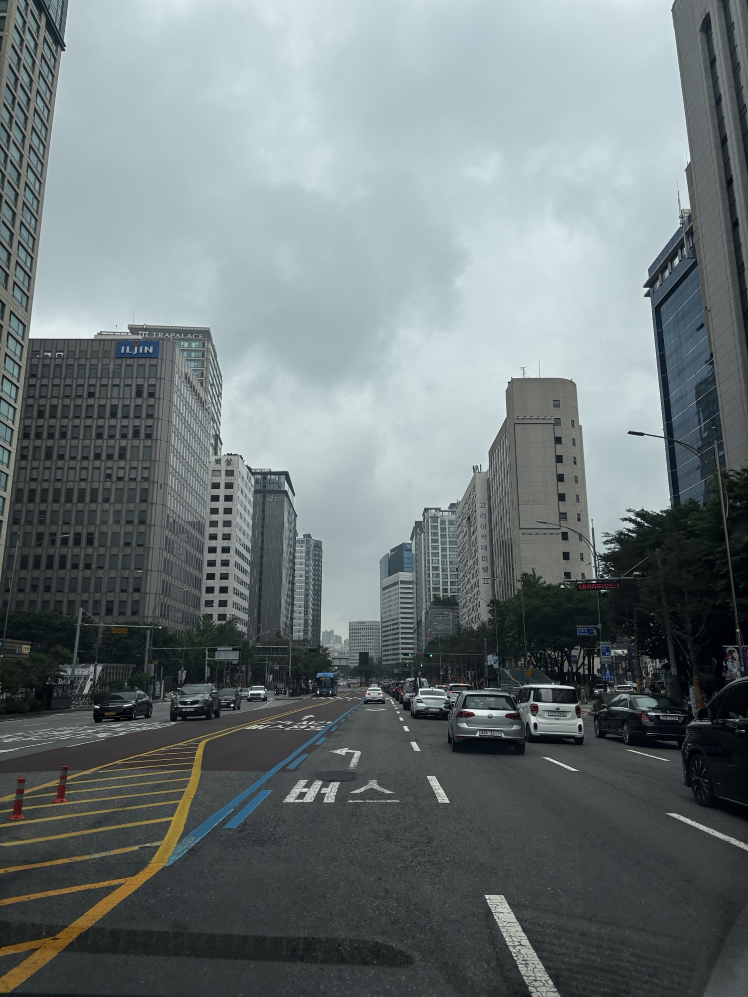 Lotnisko wydaje się puste o tej porze. Przechodzimy naprawdę szybką kontrolę graniczno -emigracyjną i może po 20 minutach od wyjścia z samolotu jesteśmy już przy odbiorze bagaży. Tu trochę gorzej, zeszło nam jakieś pół godziny. Jeszcze tylko odbieramy kartę SIM do telefonu, która da nam dostęp do lokalnego internetu i opuszczamy lotnisko. Znajdujemy naszego szofera, który już na nas czeka i jedziemy do centrum Seulu. Jak widzimy na ekranie nawigacji w tem nowym i eleganckim Hyundaiu, mamy jakieś 40km i pojedziemy jedną godzinę. No na początku jechało się szybko, bo autostradą czteropasmową, ale jak już wjechaliśmy w miasto to korki, światła co 100m, przejścia dla pieszych skutecznie czas jazdy wydłużały. Musicie wiedzieć, że powierzchnia Seulu jest tylko o 20% większa od powierzchni Warszawy a mieszka tu prawie 10 mln ludzi. W całej aglomeracji Seulu to będzie już ponad 25 mln – pamiętamy dla porównania, że w Polsce jest nas 37,6 mln.