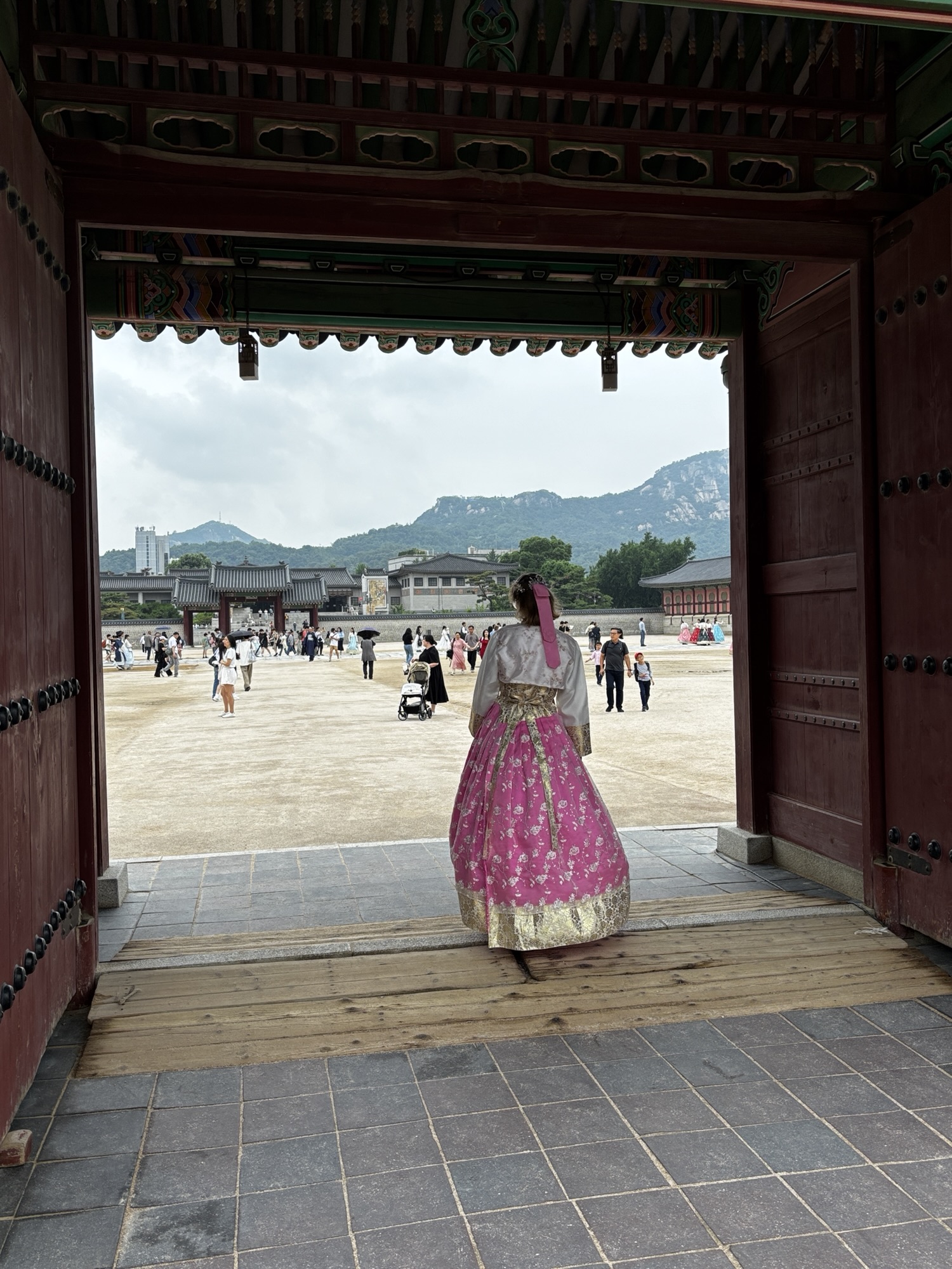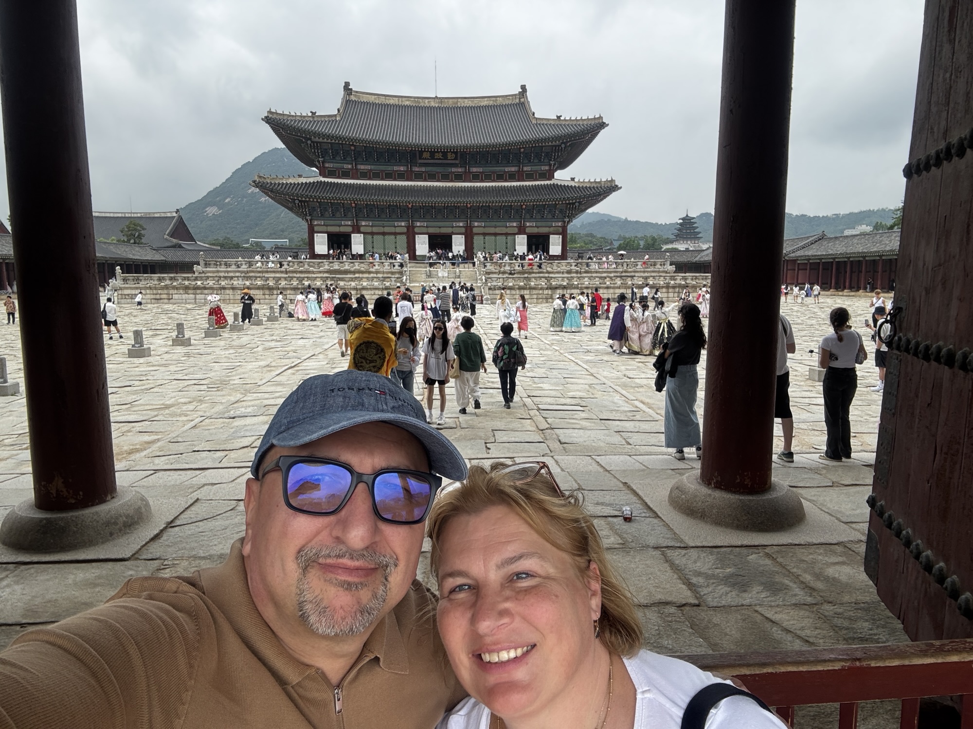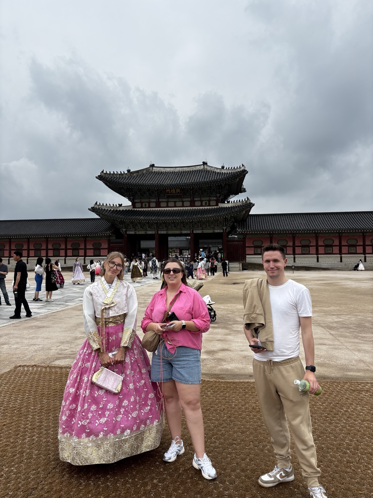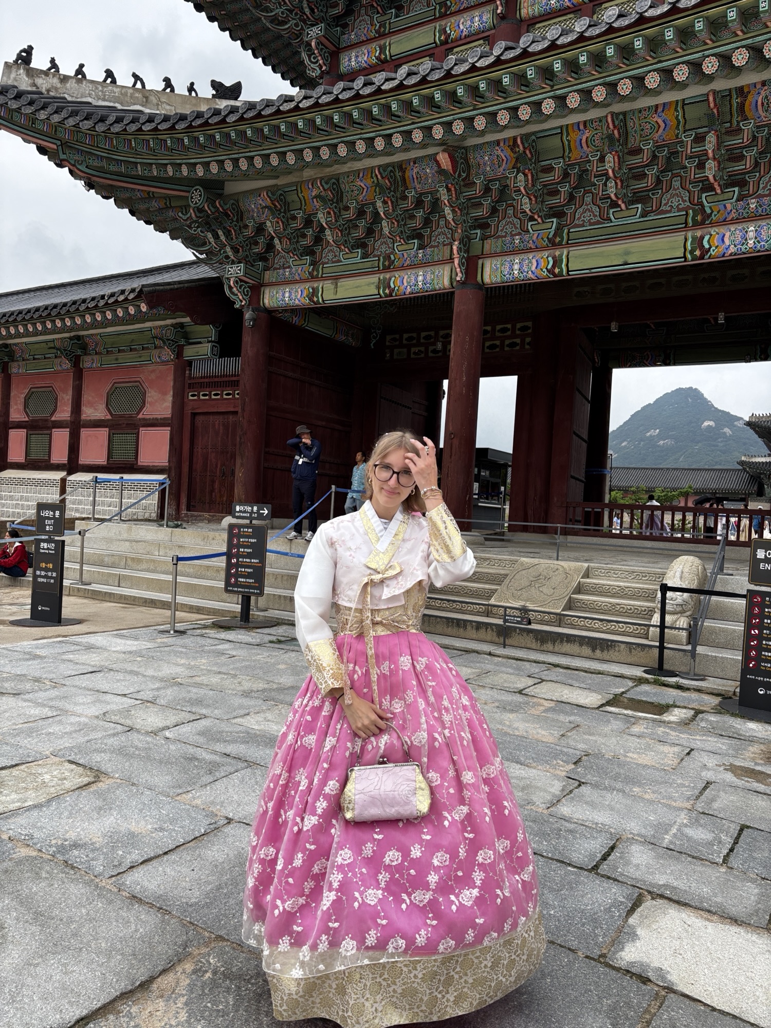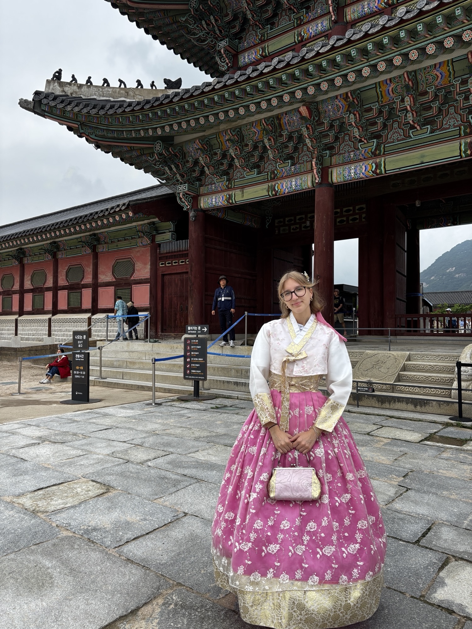 No ale w końcu o 11:40 docieramy do naszego hotelu Amare w dzielnicy Jangno. Doba hotelowa zaczyna się o 14:00 i z tego powodu nie mamy jeszcze naszych pokoi. Udaje się pozyskać jeden, który pozwolił nam na przebranie się i zostawienie walizek. Tak, mimo że zmęczenie narasta bo snu było mało a organizm dalej odczuwa środek „polskiej” nocy, to zaplanowane jest już na dziś zwiedzanie stolicy Korei. Ruszamy do pierwszej atrakcji, którą jest Pałac Gyeongbokgung. To najważniejszy i najbardziej okazały z pięciu wielkich pałaców dynastii Joseon – serce dawnej Korei i symbol narodowej dumy. Jego nazwa oznacza dosłownie „Pałac Wielkiego Błogosławieństwa”, a jego historia sięga XIV wieku. No to trochę o historii tytułem wstępu: Zbudowany w 1395 roku przez króla Taejo, założyciela dynastii Joseon, zaledwie trzy lata po ustanowieniu Seulu (wtedy Hanyang) jako stolicy. Zniszczony podczas inwazji japońskiej w 1592 roku i przez ponad 270 lat pozostał w ruinie. Odbudowany w XIX wieku, ponownie ucierpiał podczas japońskiej okupacji w XX wieku. Od lat 90. trwa wieloetapowa rekonstrukcja – dziś odwiedzający mogą podziwiać kilkadziesiąt odrestaurowanych pawilonów. Dochodzimy do niego w 30 minut ale przed wejściem mamy jeszcze jedną rzecz do załatwienia. Właściwie to Zuzia ma, gdyż bardzo chciała zwiedzać to miejsce w typowym stroju koreańskim zwanym – hanbok. To jest popularne tutaj aby się przebierać w te oryginalne stroje i w takim ubiorze zwiedzać ten pałac. Znajdujemy wypożyczalnie sukien hanbok, która znajduje się może ze 100m od wejścia do pałacu i już za 15 minut Zuzia prezentuje się nam w pięknej, koreańskiej sukni oraz z nowym upięciu włosów.