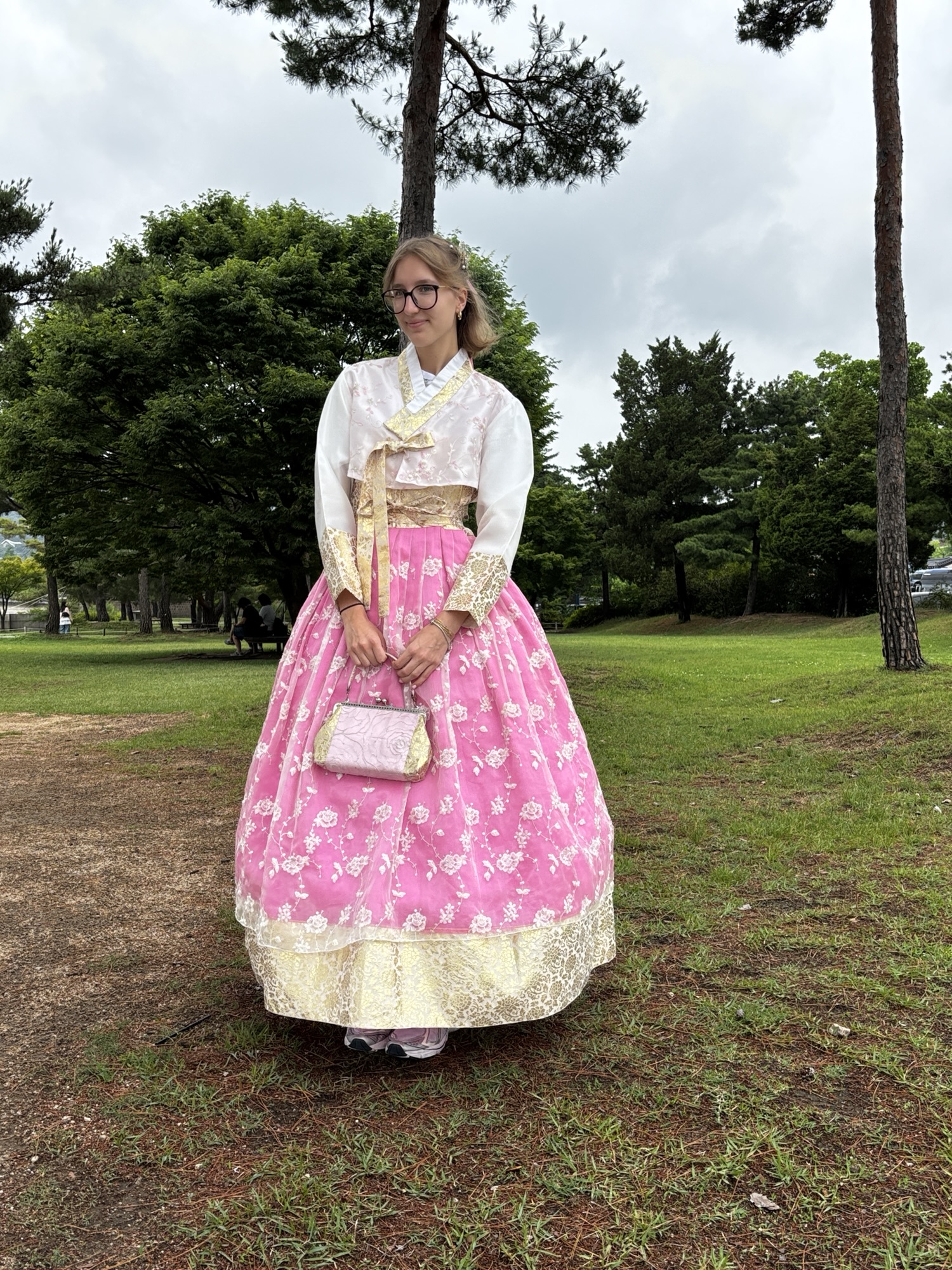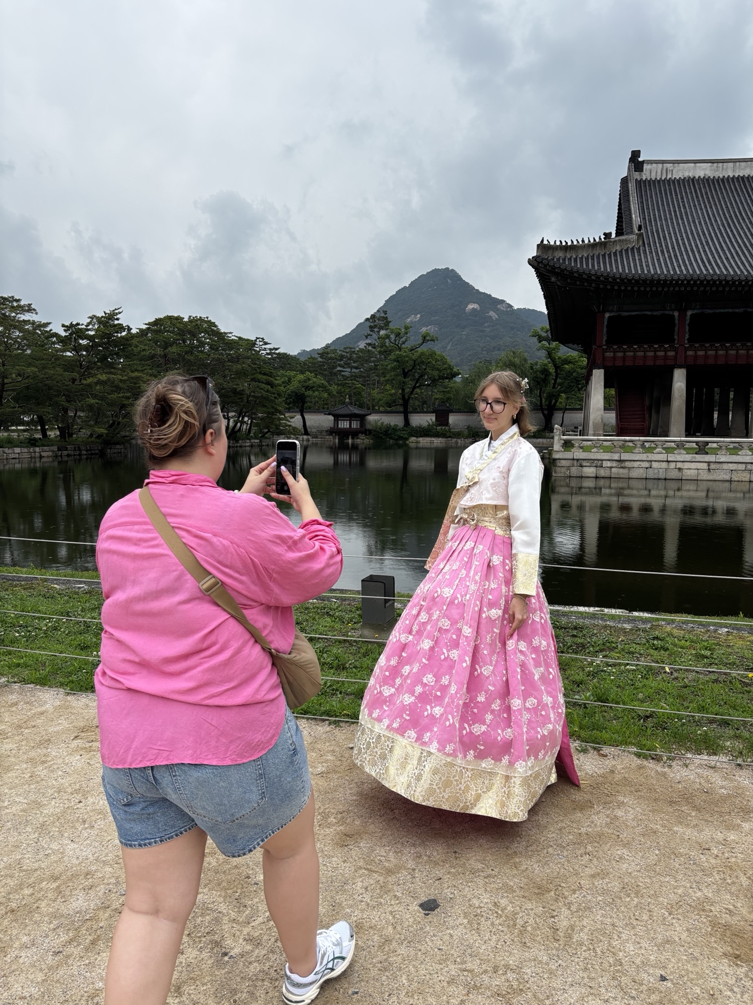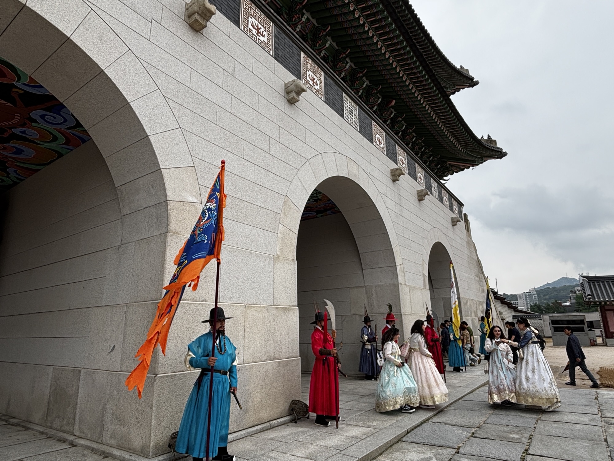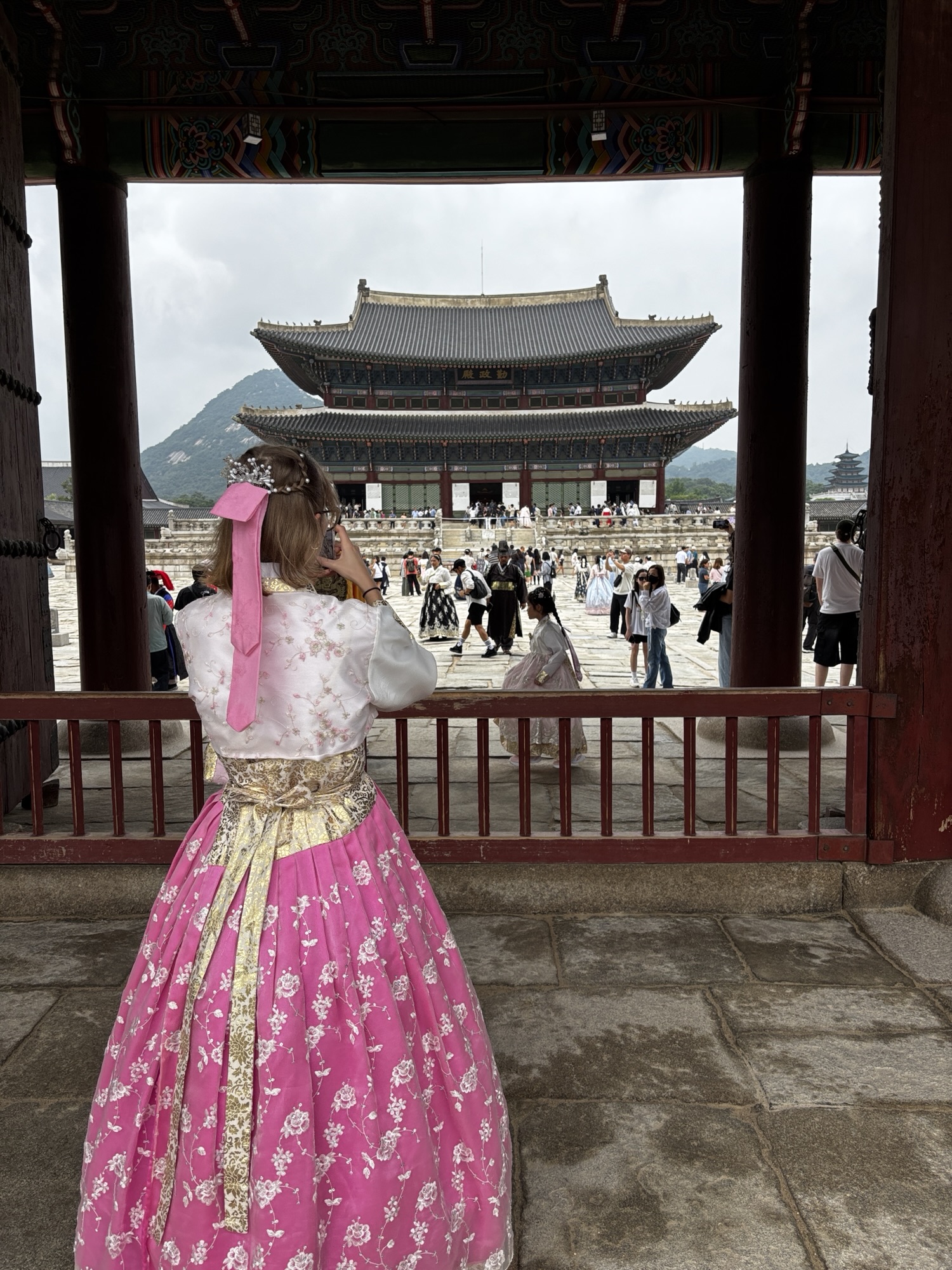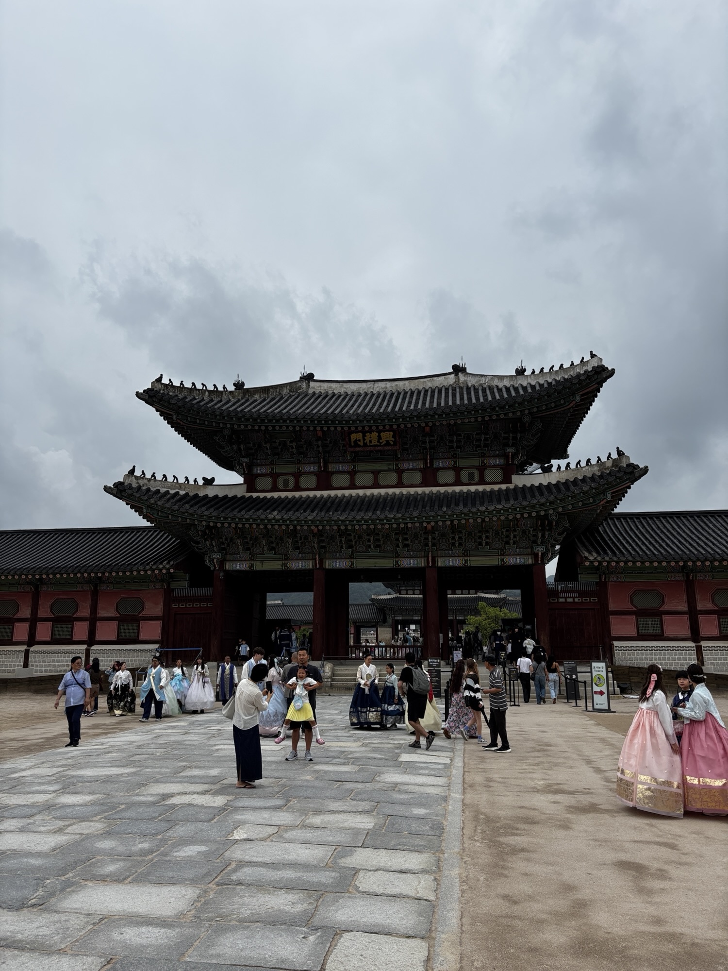 No ale w końcu o 11:40 docieramy do naszego hotelu Amare w dzielnicy Jangno. Doba hotelowa zaczyna się o 14:00 i z tego powodu nie mamy jeszcze naszych pokoi. Udaje się pozyskać jeden, który pozwolił nam na przebranie się i zostawienie walizek. Tak, mimo że zmęczenie narasta bo snu było mało a organizm dalej odczuwa środek „polskiej” nocy, to zaplanowane jest już na dziś zwiedzanie stolicy Korei. Ruszamy do pierwszej atrakcji, którą jest Pałac Gyeongbokgung. To najważniejszy i najbardziej okazały z pięciu wielkich pałaców dynastii Joseon – serce dawnej Korei i symbol narodowej dumy. Jego nazwa oznacza dosłownie „Pałac Wielkiego Błogosławieństwa”, a jego historia sięga XIV wieku. No to trochę o historii tytułem wstępu: Zbudowany w 1395 roku przez króla Taejo, założyciela dynastii Joseon, zaledwie trzy lata po ustanowieniu Seulu (wtedy Hanyang) jako stolicy. Zniszczony podczas inwazji japońskiej w 1592 roku i przez ponad 270 lat pozostał w ruinie. Odbudowany w XIX wieku, ponownie ucierpiał podczas japońskiej okupacji w XX wieku. Od lat 90. trwa wieloetapowa rekonstrukcja – dziś odwiedzający mogą podziwiać kilkadziesiąt odrestaurowanych pawilonów. Dochodzimy do niego w 30 minut ale przed wejściem mamy jeszcze jedną rzecz do załatwienia. Właściwie to Zuzia ma, gdyż bardzo chciała zwiedzać to miejsce w typowym stroju koreańskim zwanym – hanbok. To jest popularne tutaj aby się przebierać w te oryginalne stroje i w takim ubiorze zwiedzać ten pałac. Znajdujemy wypożyczalnie sukien hanbok, która znajduje się może ze 100m od wejścia do pałacu i już za 15 minut Zuzia prezentuje się nam w pięknej, koreańskiej sukni oraz z nowym upięciu włosów.