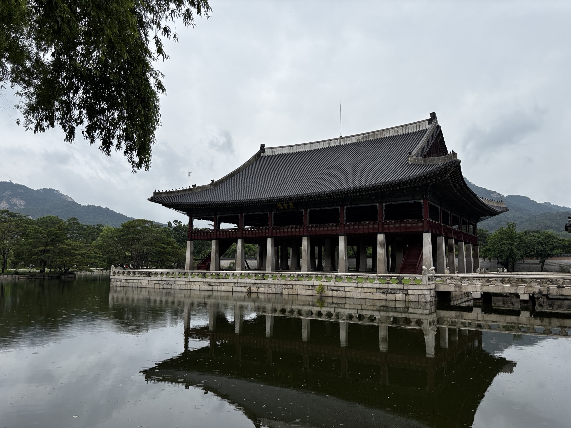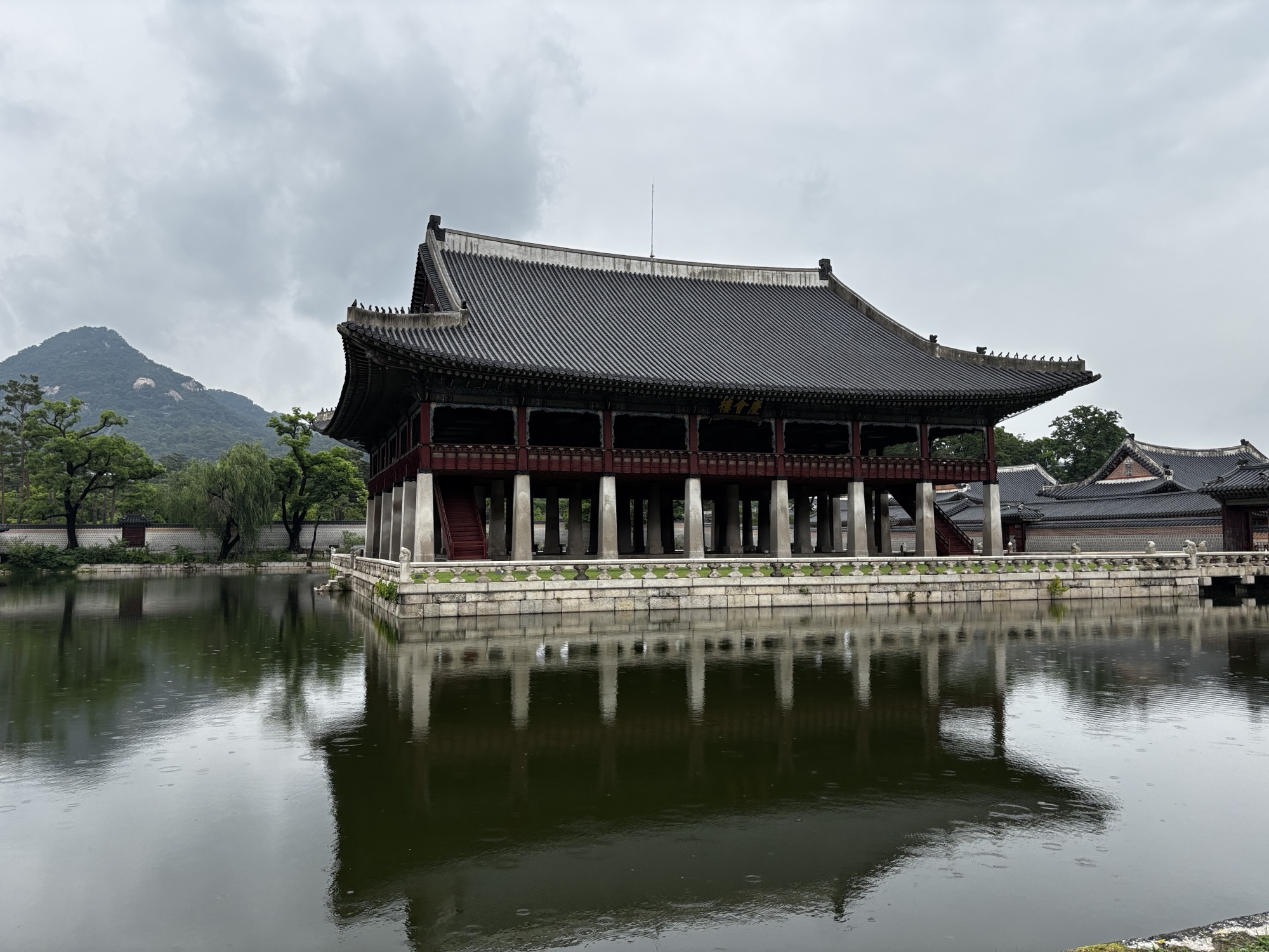 Dalej idziemy do Gyeonghoeru. To pawilon na wodzie – jedno z najpiękniejszych miejsc w całym kompleksie. Otoczony stawem z lotosami, był miejscem bankietów królewskich. Dziś, o tej porze roku lotosów nie ma 😄