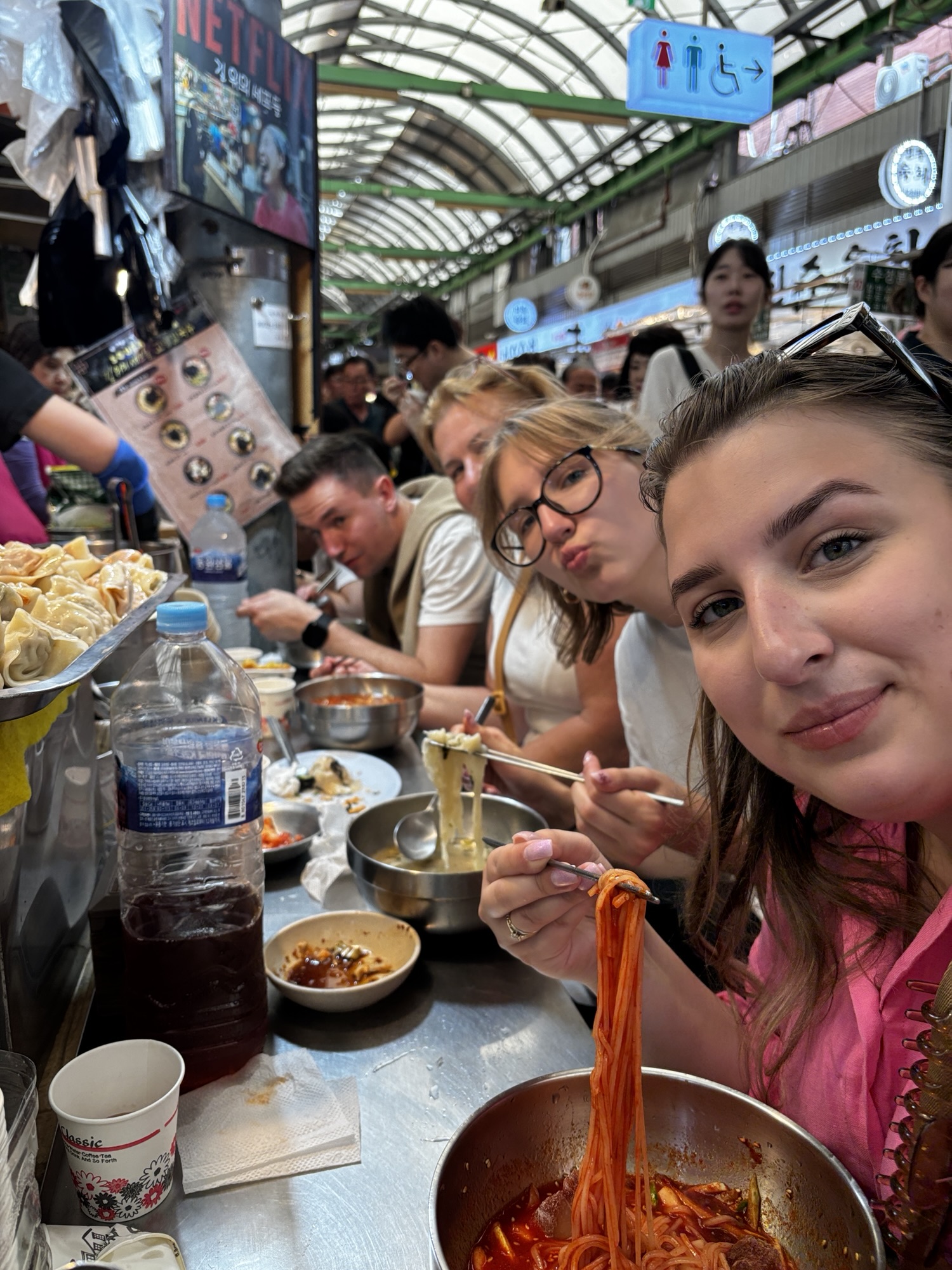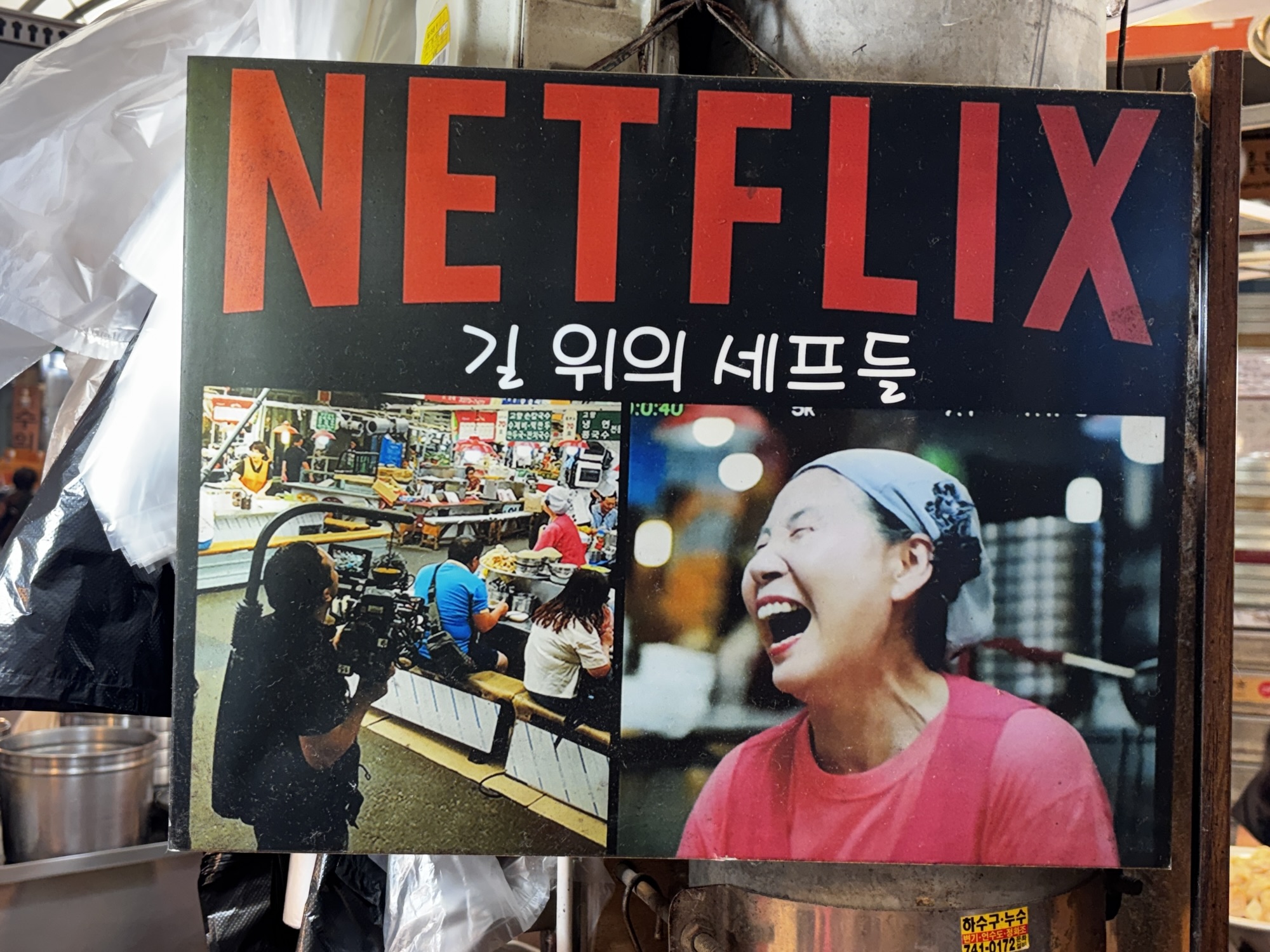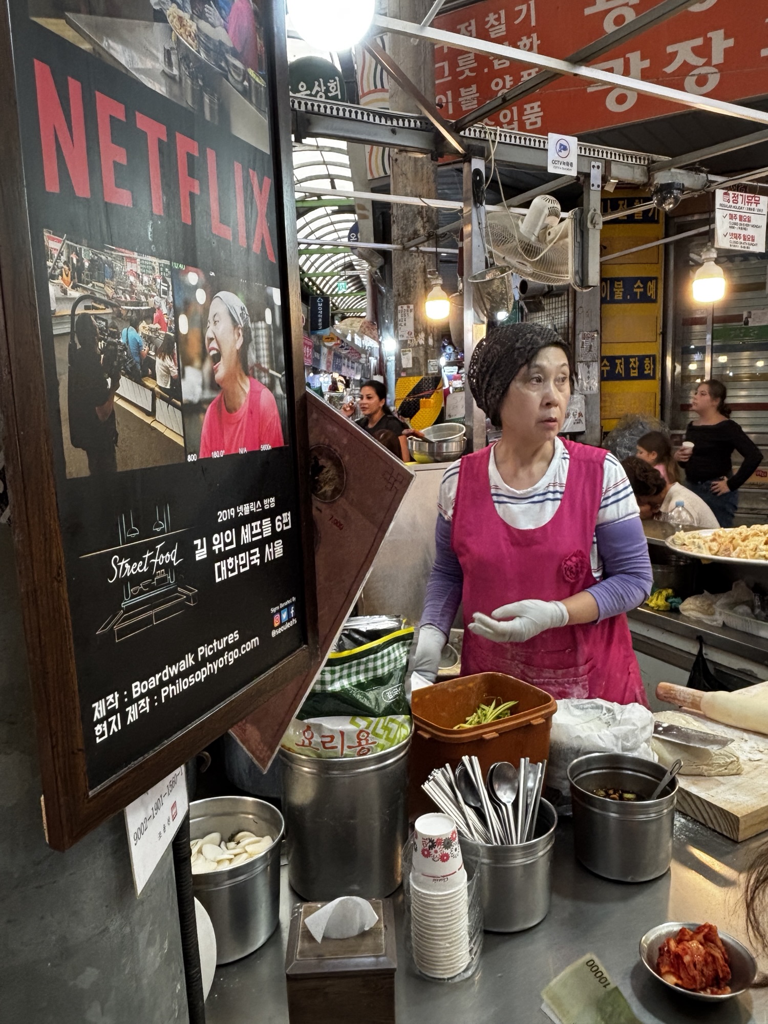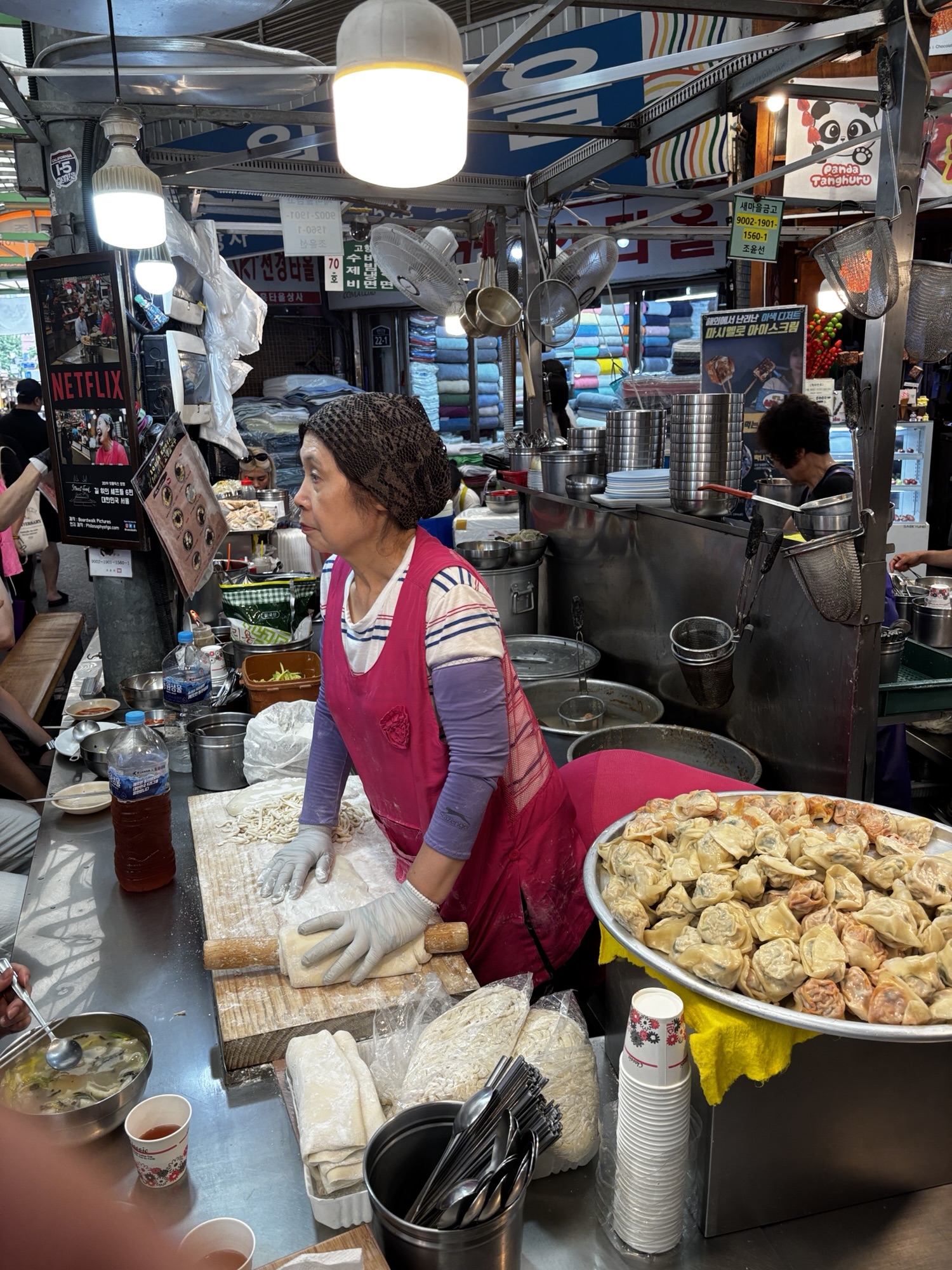 Gwangjang Market zdobył popularność również dzięki pojawieniu się w wielu programach kulinarnych i dokumentach, w tym w serialu Netflixa „Street Food: Asia”, gdzie przedstawiono sylwetki lokalnych kucharzy i historie stojące za ich potrawami. I my odnajdujemy główną bohaterkę jednego z tych filmów – panią Cho, która jest właścicielką budki Gohyang Kalguksu Stall, specjalizującej się w tradycyjnych ręcznie ciętych makaronach kalguksu oraz pierogach mandu, które przygotowuje sama przy klientach. Jej historia była centralnym wątkiem odcinka 6, sezonu pierwszego – opowiedziano o tym, jak korzystała ze swoich umiejętności, by wesprzeć rodzinę w trudnych chwilach. Dzięki Netflixowi zyskała przydomek „Netflix Noodle Lady” albo „Netflix Noodle Queen”. Oczywiście odnajdujemy w gąszczu podobnych stoisk to jedno i szczęśliwie trafimy na czas kiedy sa miejsca. Zamawiamy rzeczone pierożki i zupy z tymi słynnymi makaronami. Super pyszne, ale porcje tak ogromne że niestety nie dojadamy.