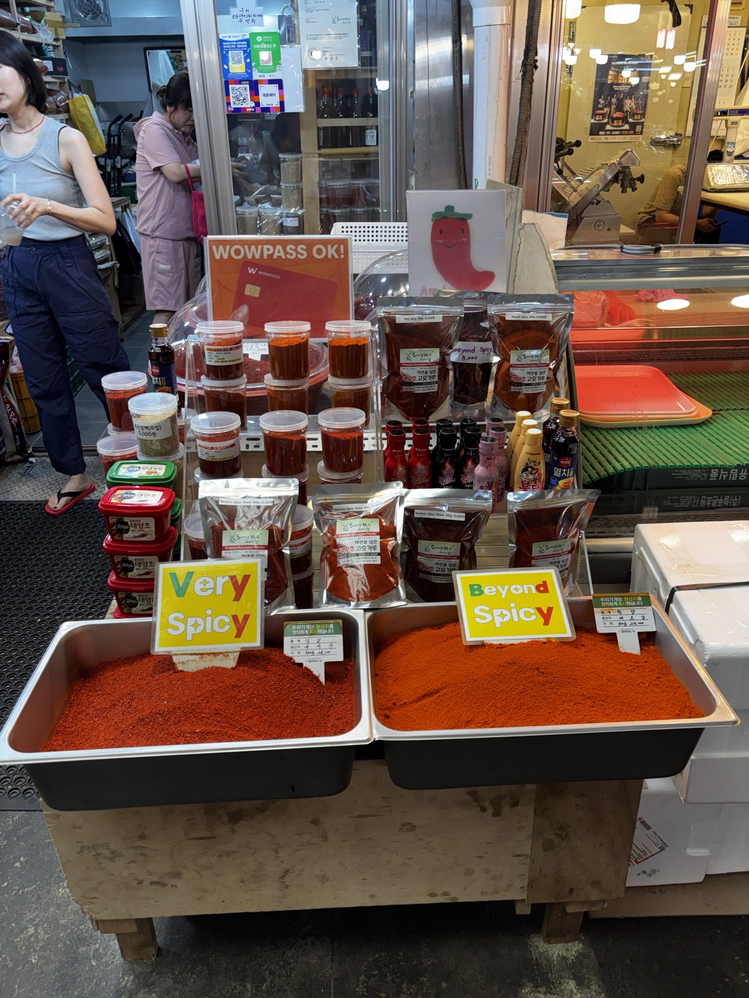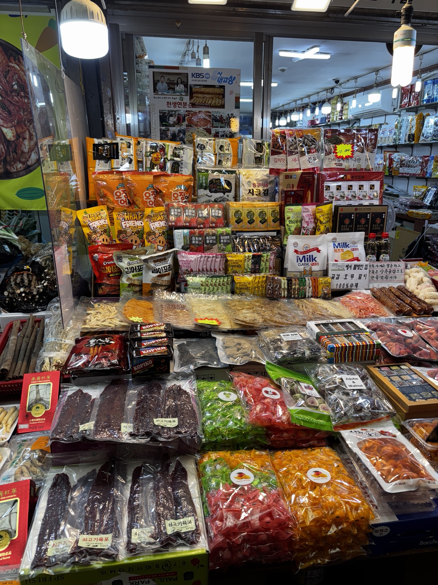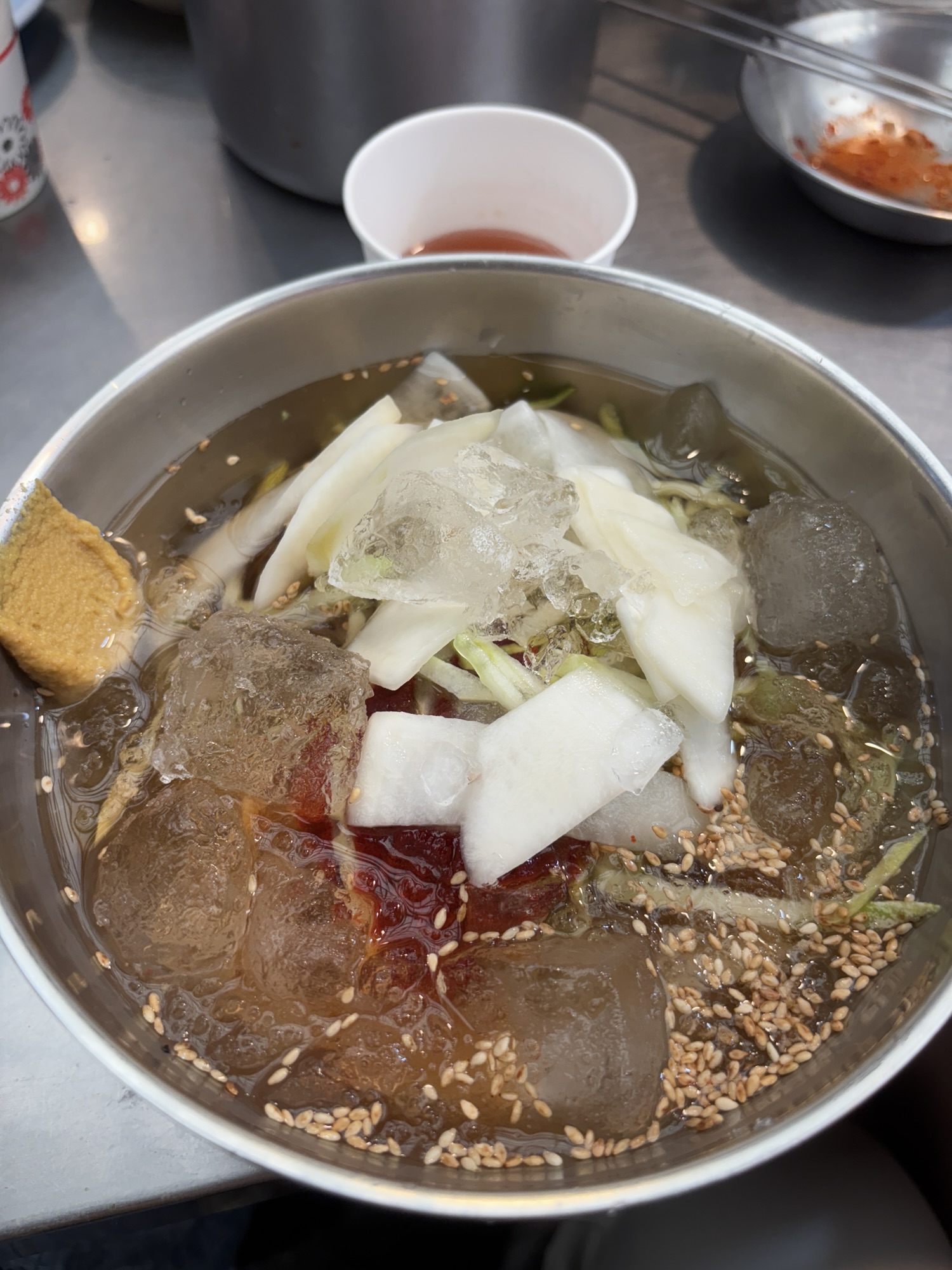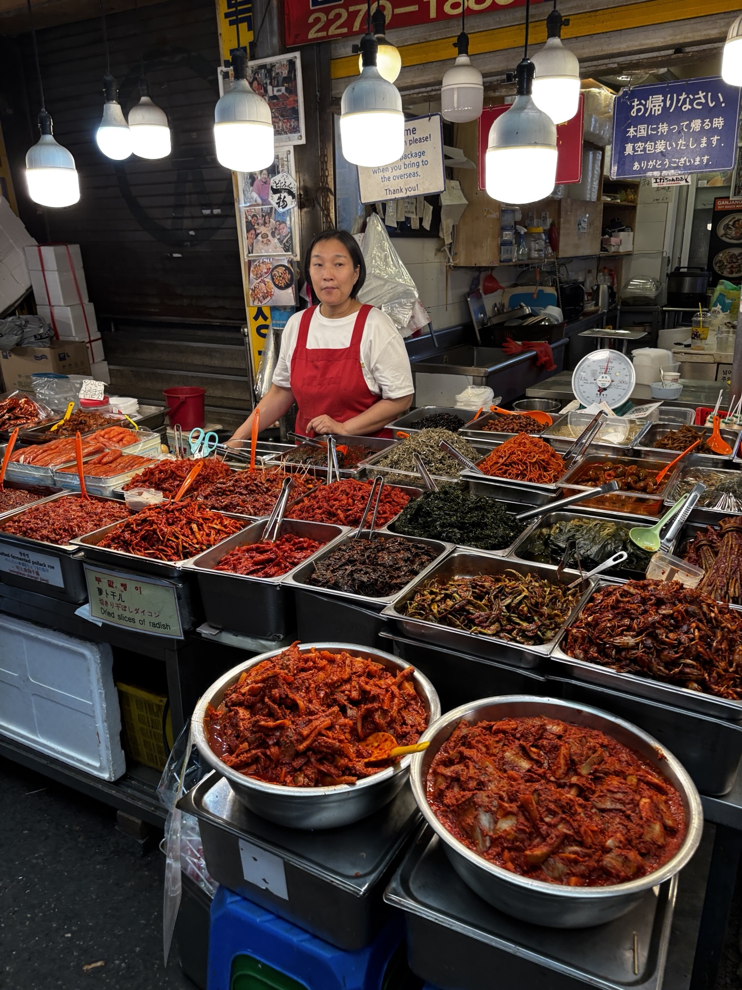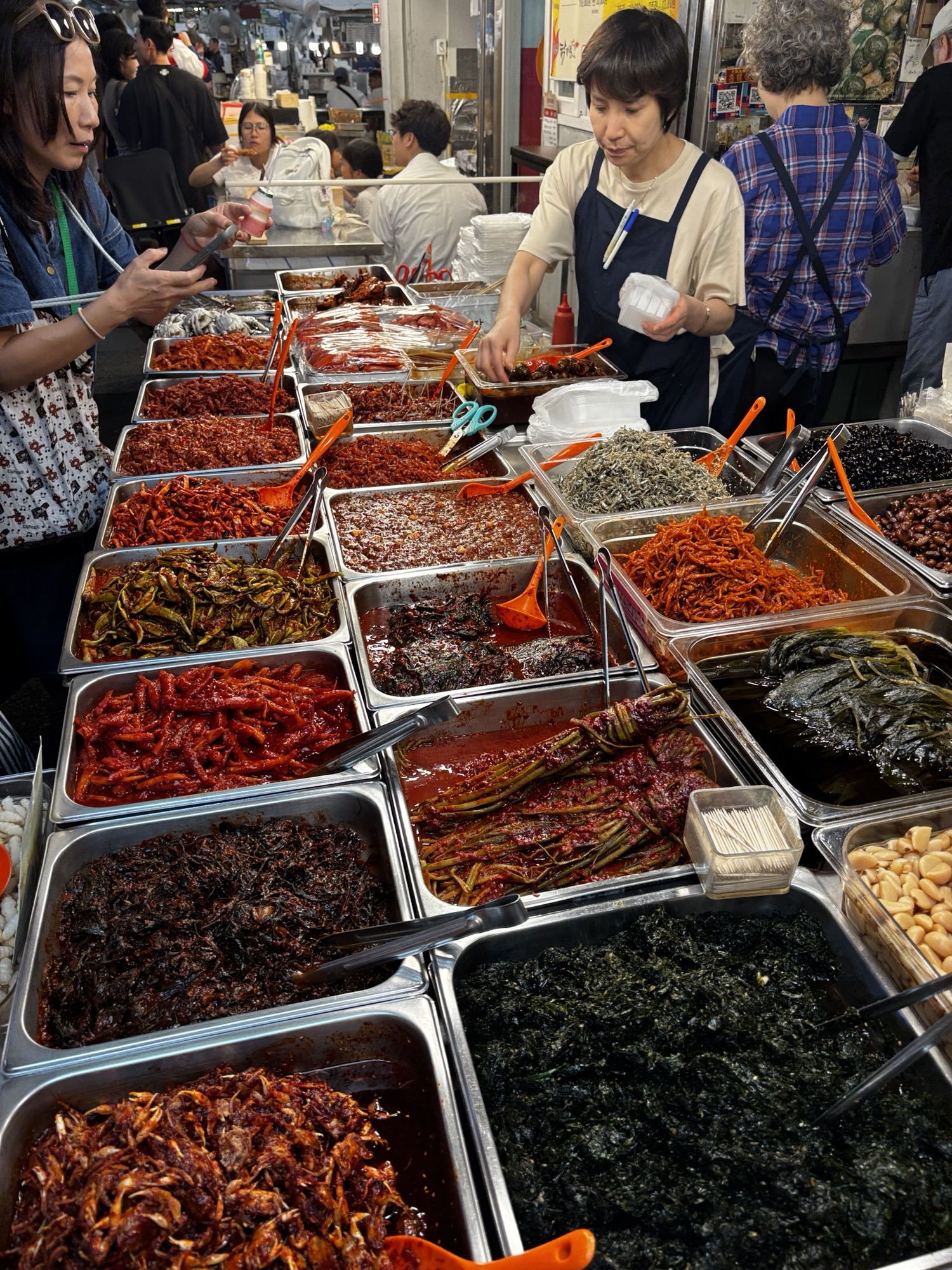 Gwangjang Market zdobył popularność również dzięki pojawieniu się w wielu programach kulinarnych i dokumentach, w tym w serialu Netflixa „Street Food: Asia”, gdzie przedstawiono sylwetki lokalnych kucharzy i historie stojące za ich potrawami. I my odnajdujemy główną bohaterkę jednego z tych filmów – panią Cho, która jest właścicielką budki Gohyang Kalguksu Stall, specjalizującej się w tradycyjnych ręcznie ciętych makaronach kalguksu oraz pierogach mandu, które przygotowuje sama przy klientach. Jej historia była centralnym wątkiem odcinka 6, sezonu pierwszego – opowiedziano o tym, jak korzystała ze swoich umiejętności, by wesprzeć rodzinę w trudnych chwilach. Dzięki Netflixowi zyskała przydomek „Netflix Noodle Lady” albo „Netflix Noodle Queen”. Oczywiście odnajdujemy w gąszczu podobnych stoisk to jedno i szczęśliwie trafimy na czas kiedy sa miejsca. Zamawiamy rzeczone pierożki i zupy z tymi słynnymi makaronami. Super pyszne, ale porcje tak ogromne że niestety nie dojadamy.