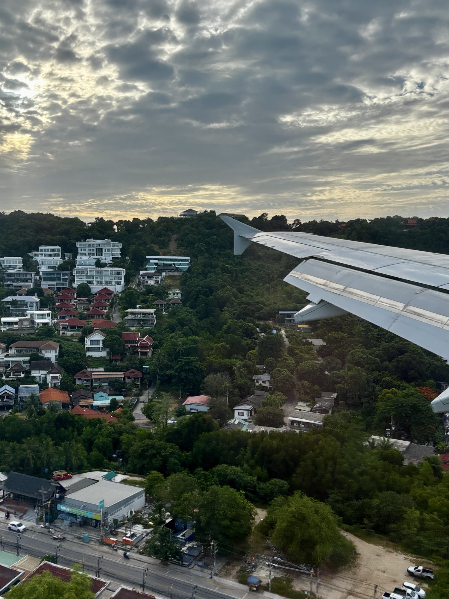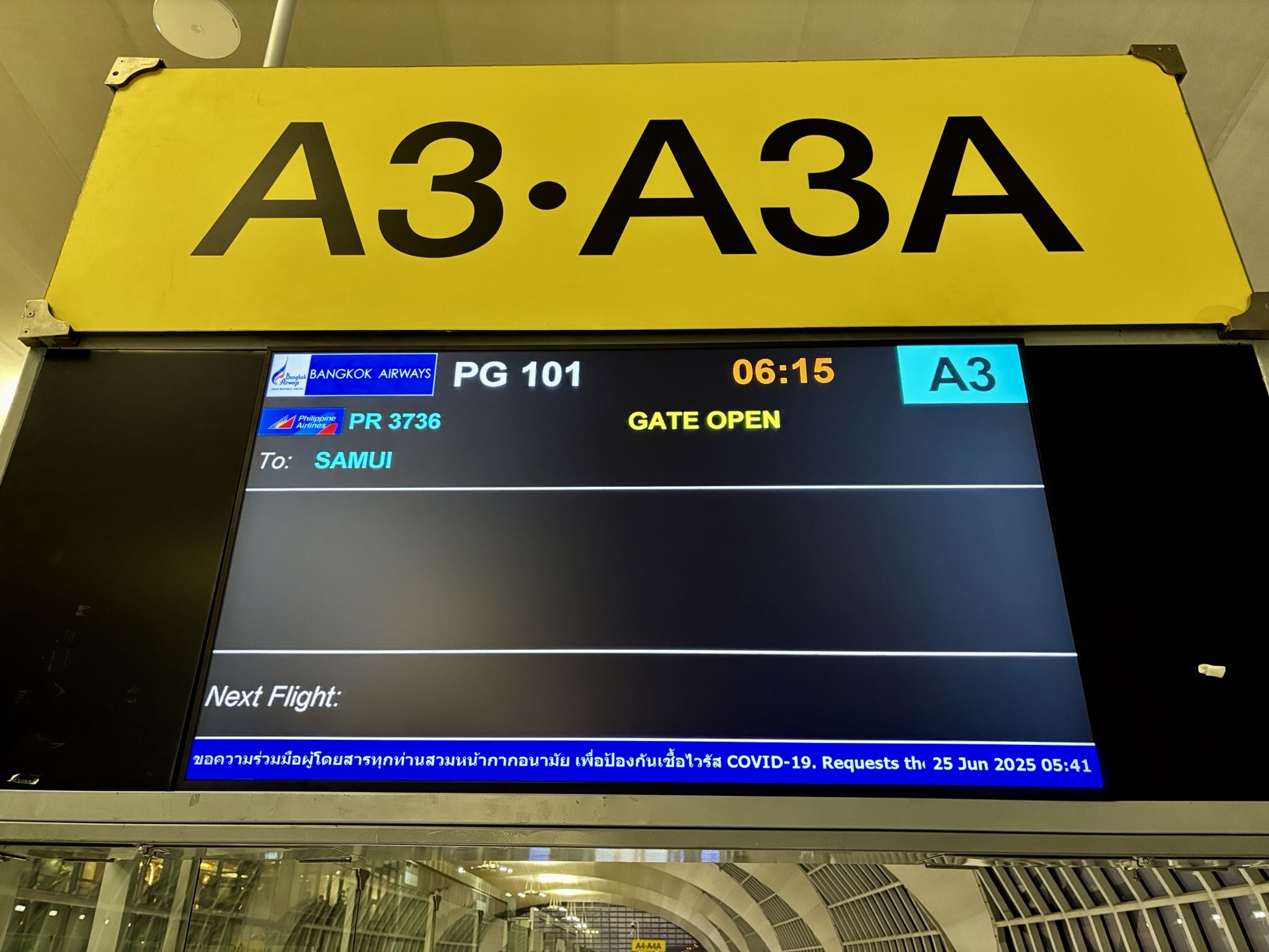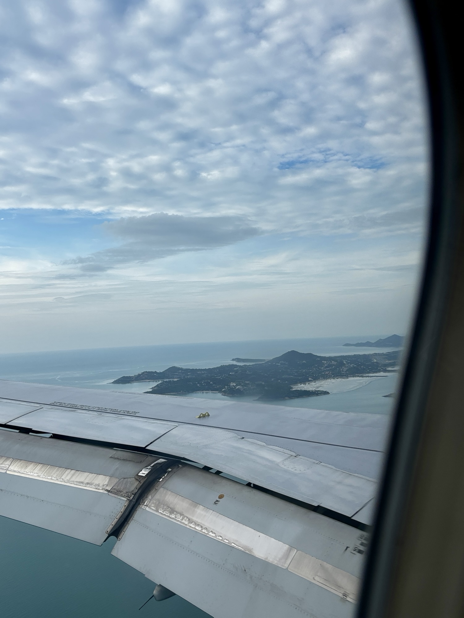 Do następnego lotu mamy sześć godzin. Sporo, ale nie jest ten drugi lot na jednej rezerwacji i musimy odebrać bagaże i ponownie je nadać co zajmie trochę czasu. W rzeczywistości, kontrola imigracyjna i cała zabawa z bagażami zajęła tylko godzinkę. Jeszcze proces zakupu nowej karty SIM aby komunikacja była i znajdujemy sobie ustronne miejsce na odpoczynek. O 4:30 ruszamy już w kierunku odlotów krajowych i po szybkiej kontroli bezpieczeństwa idziemy w kierunku bramki A3, skąd samolot linii Bangkok Airways zabierze nas na wyspę Samui. Boarding zaczyna się planowo czyli o 5:40, kołowanie i start na południe. W międzyczasie wstaje słońce, a dokładniej – robi się jasno, bo słońca nie widać przez chmury. Lipa z pogodą pomyśleliśmy, oby u nas świeciło ☀️