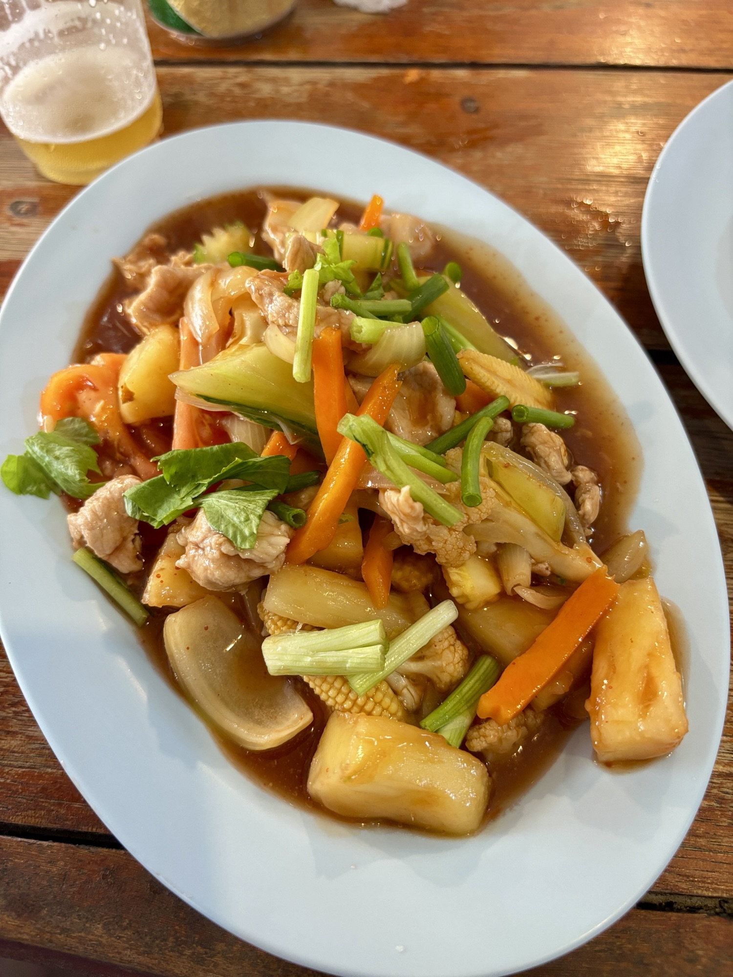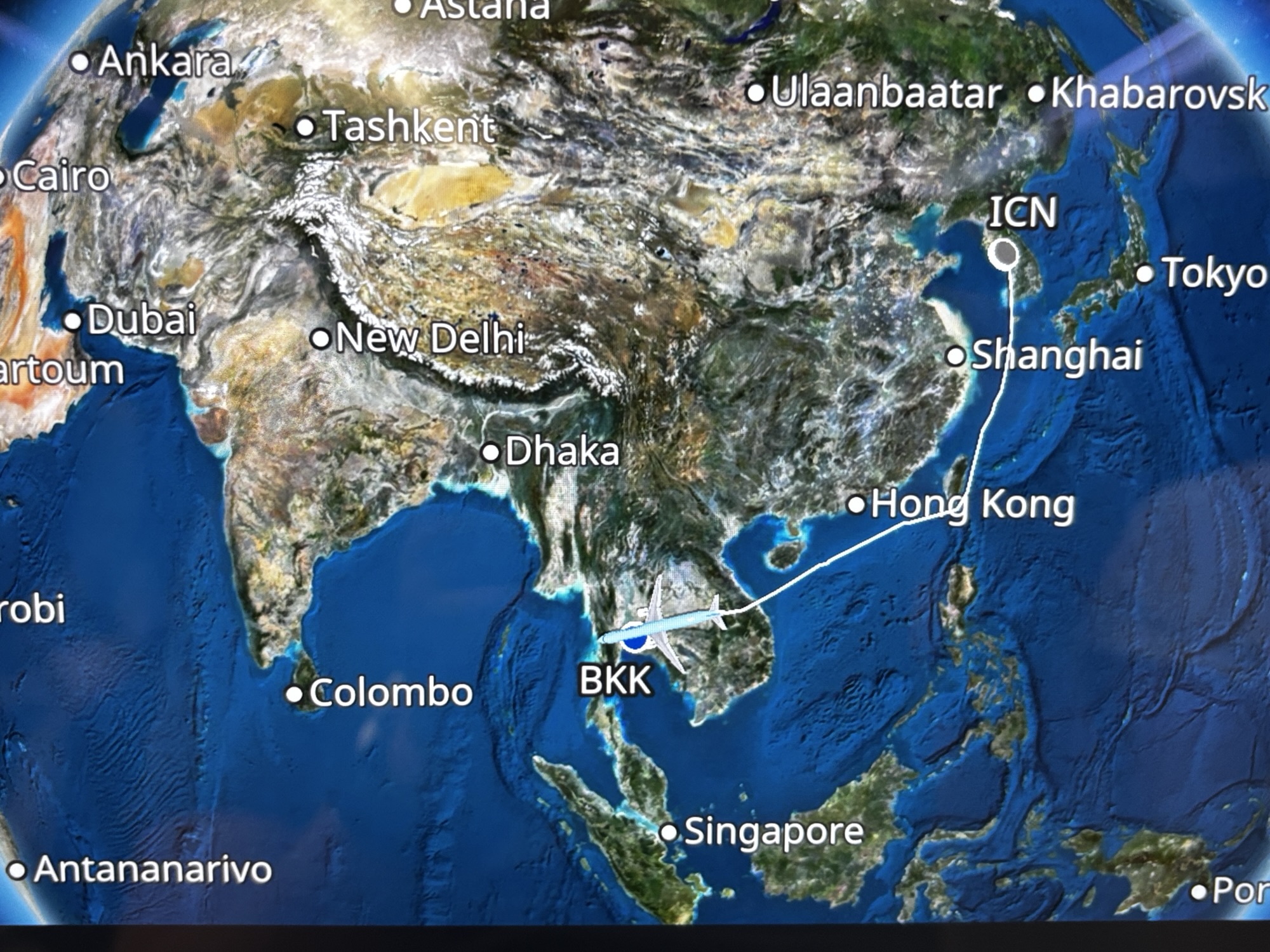 Zaraz po starcie z Seulu, obsługa uwija się z serwisem, aby jak najszybciej go podać i pozostawić resztę czasu na odpoczynek. Do wyboru jest lokalny bibimbab lub wołowina w chińskim stylu. Polecimy nad Chinami to chińczyka wezmę pomyślałem. Smakowało całkiem spoko, zresztą najedzeni byliśmy jeszcze z restauracji na lotnisku, ale nad Chinami to my nie lecielibyśmy. Mimo, że to krótsza droga, to kapitan poleciał wpierw na południe, potem w kierunku Tajwanu i tak ominął całe Chiny. Nie wiem czemu tak, ale lot czasowo przebiegał zgodniej planem i po 5 godzinach wylądowaliśmy szczęśliwie w Bangkoku. Jest godzina 1sza w nocy i różnica do Polski to +5h, czyli po drodze „zgubiliśmy” dwie godziny różnicy czasowej jaką była w Korei.
