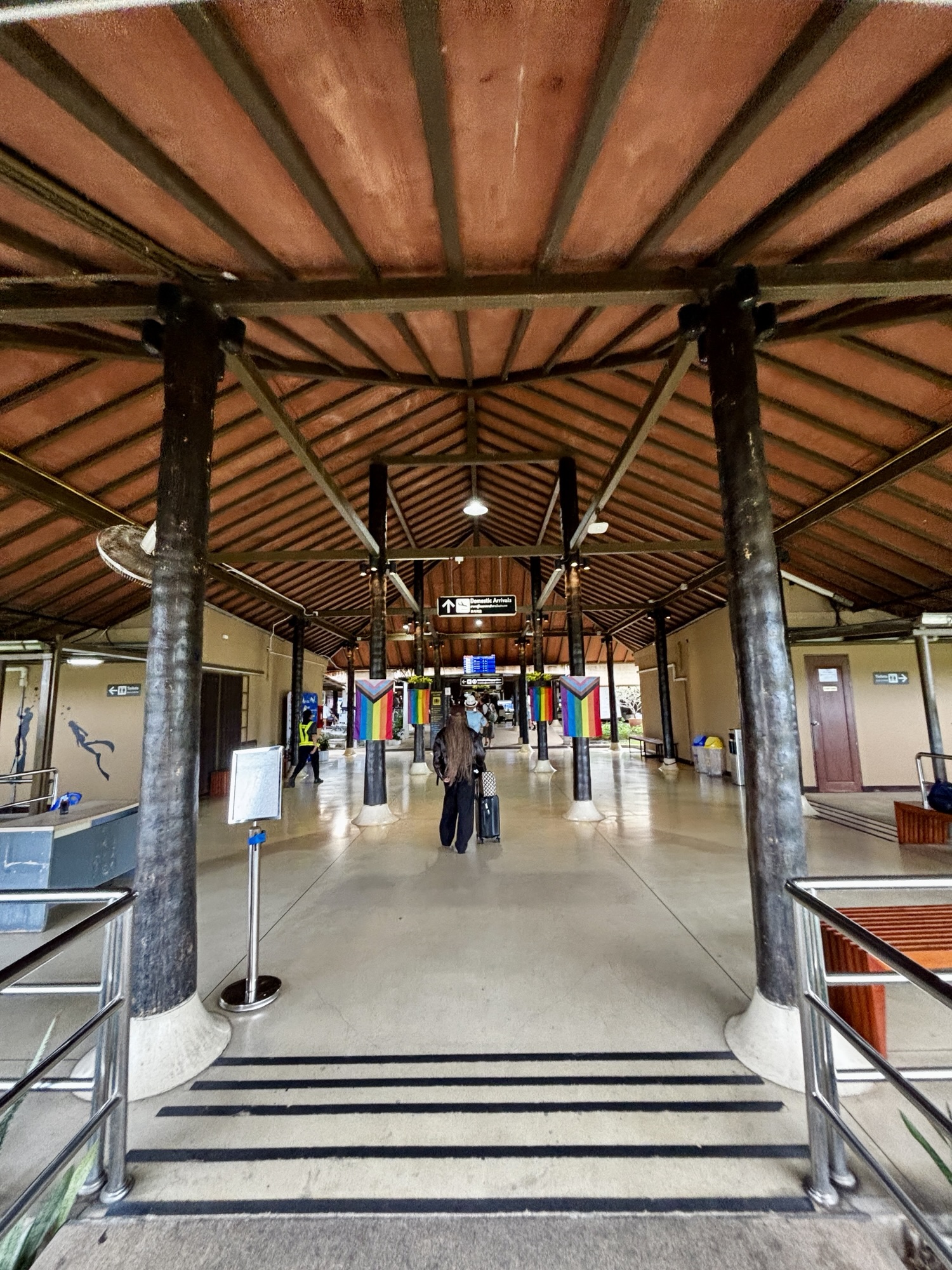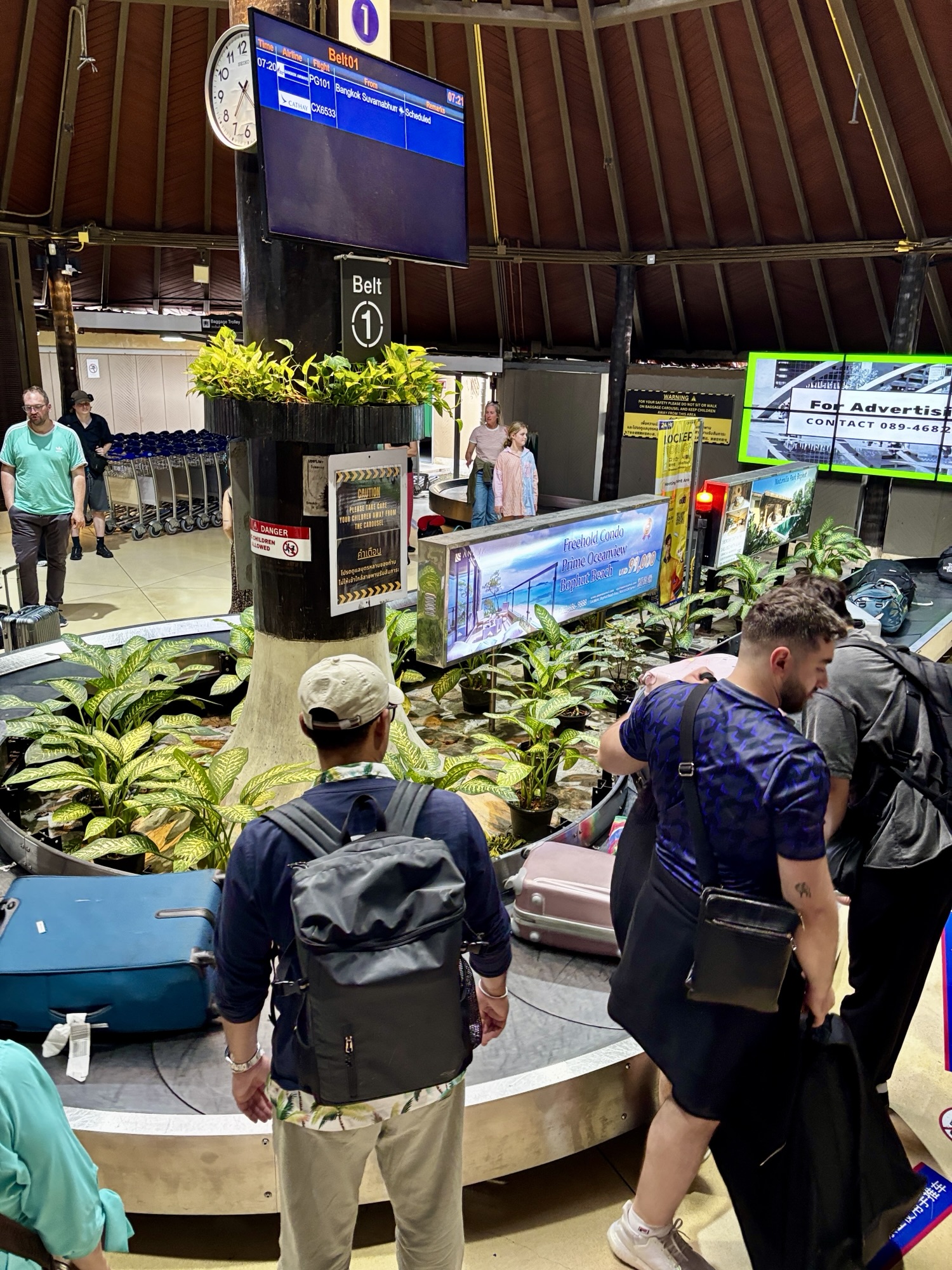 Mamy małe zamieszanie na wyjściu z samolotu, gdyż Zuzi spadło gdzieś podczas lądowania etui od airpodsów i poleciało podczas hamowania kilku rzędów do przodu. Musieliśmy poczekać aż wszyscy opuszczą maszynę i poszukać tego niewielkiego przedmiotu. Na szczęście znajdujemy go kilka rzędów przed nami pod jednym z foteli. Spod samolotu zabiera nas taki niewielki, otwarty pojazd, gdyż nie ma tu autobusów. Do terminala przylotowego jest 200m, zaraz także odbieramy nasze bagaże. Lotnisko jest malutkie i takie w stylu tropikalnym. Budynki sa otwarte, parterowe i bardzo klimatyczne – wszystko już wprowadza przylatujących w klimat wypoczynkowy. Po chmurach już nie ma ani śladu. Słońce zaczyna już piec na dobre ☀️☀️☀️