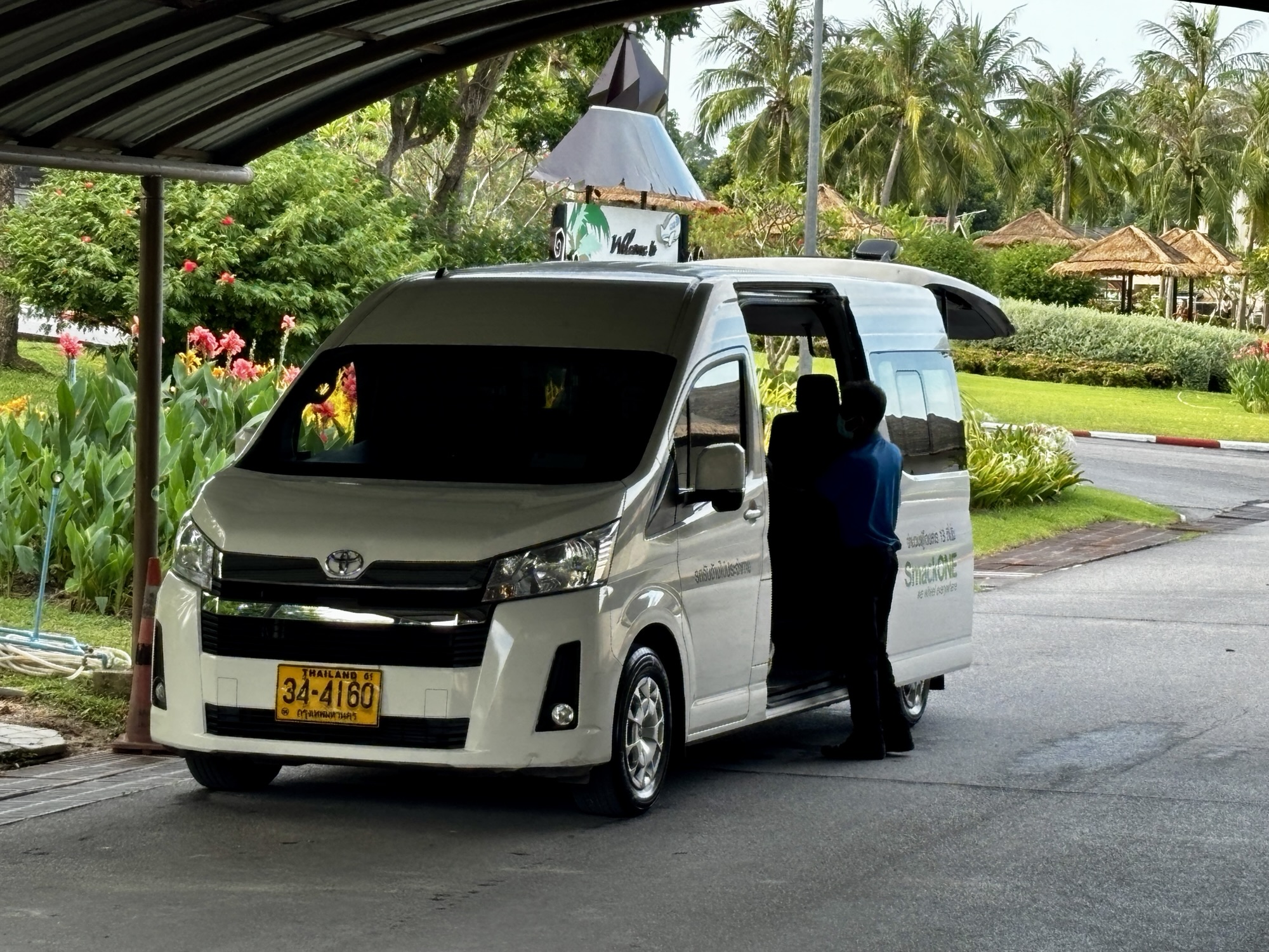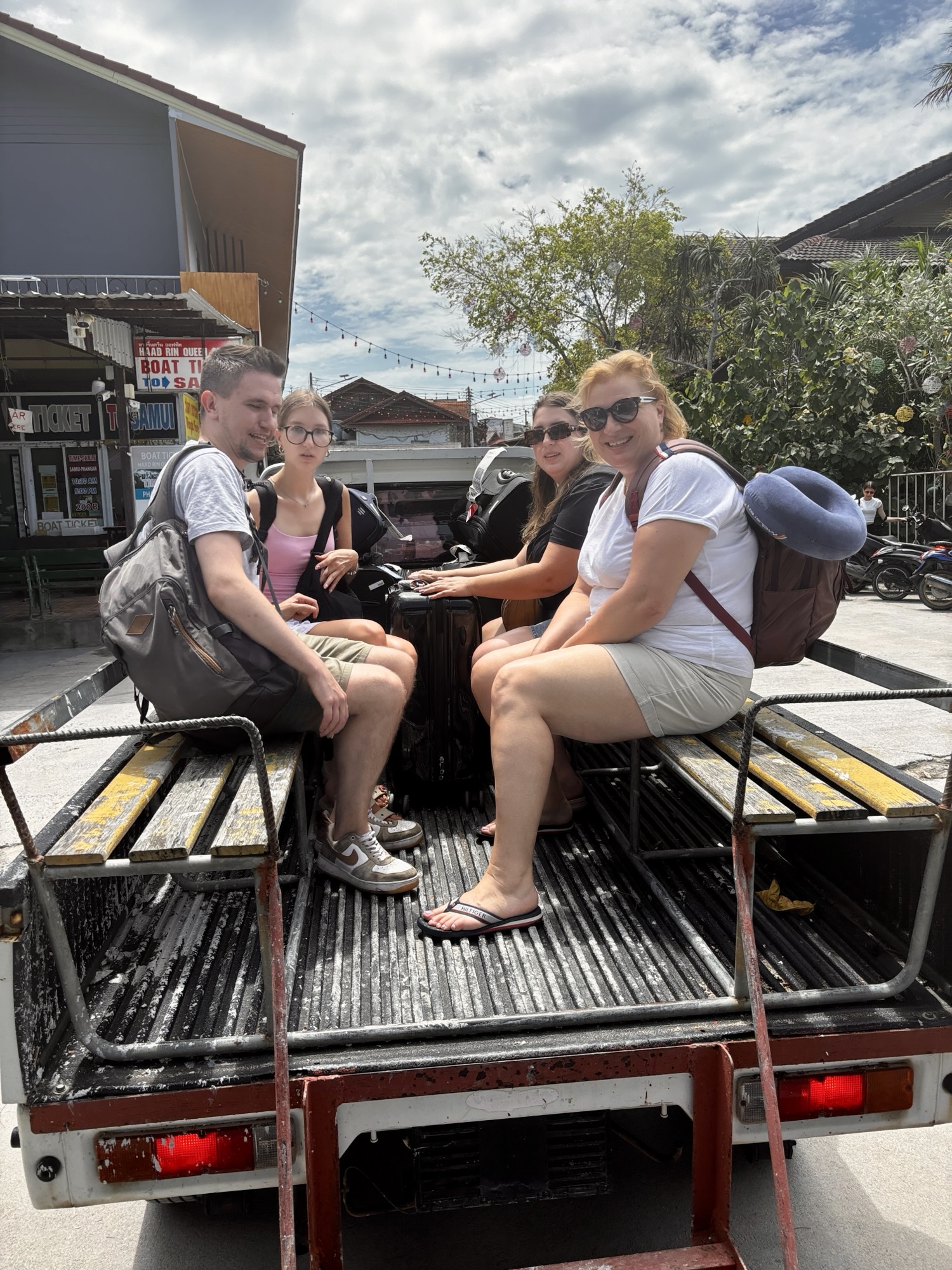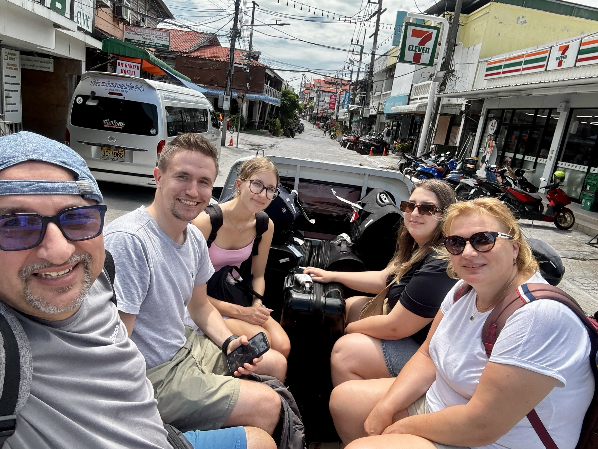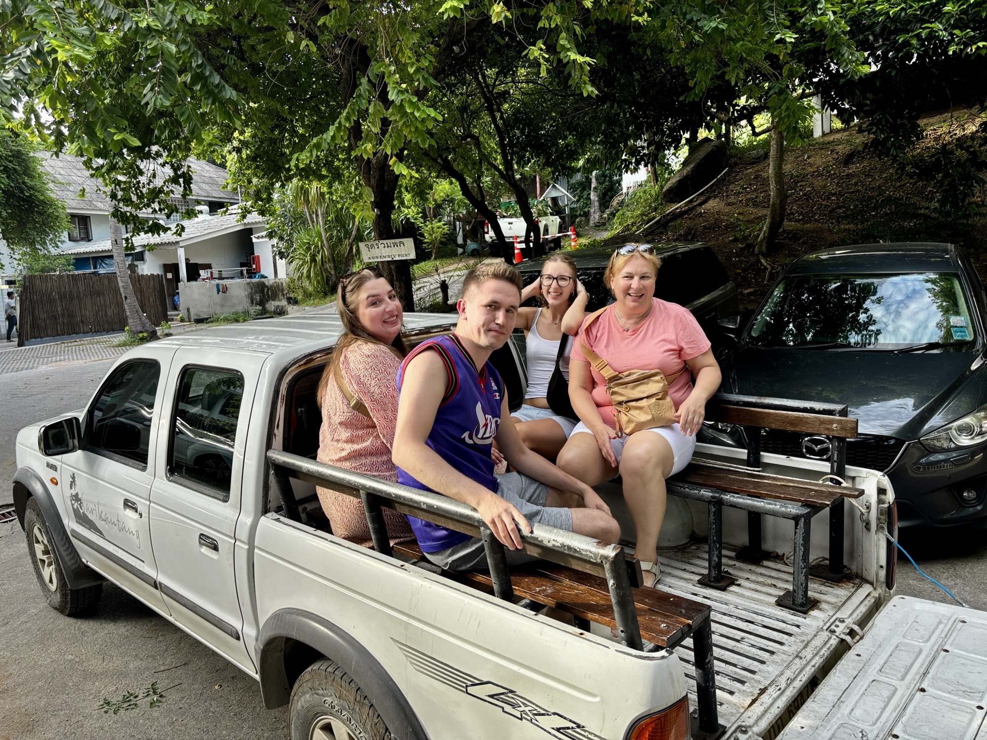 Zaraz „wyhacza” nas lokalny przewoźnik, który informuje, że chociaż do naszego hotelu jest tylko 1km to droga jest pod górę i nie damy rady z naszymi walizkami. W sumie wiem, źe jesteśmy na górzystym cyplu i droga będzie tak wyglądać, wiec zgadzamy się na podwózkę. Środek transportu charakterystyczny dla górzystych wysepek w Tajlandii, gdzie tuk tuki nie dają rady.