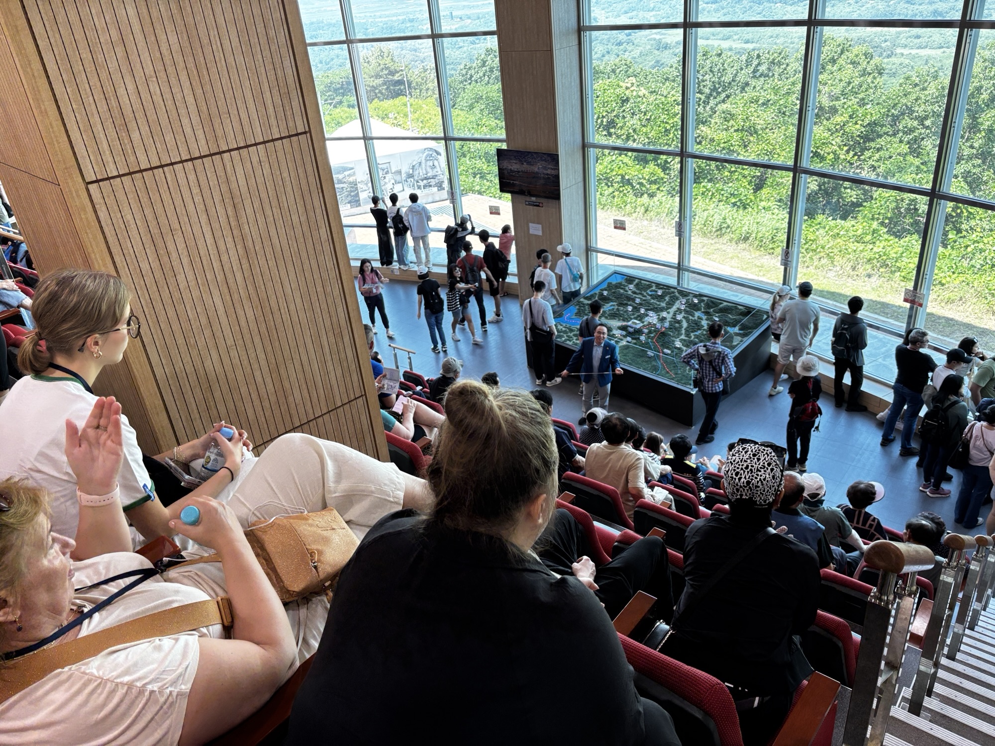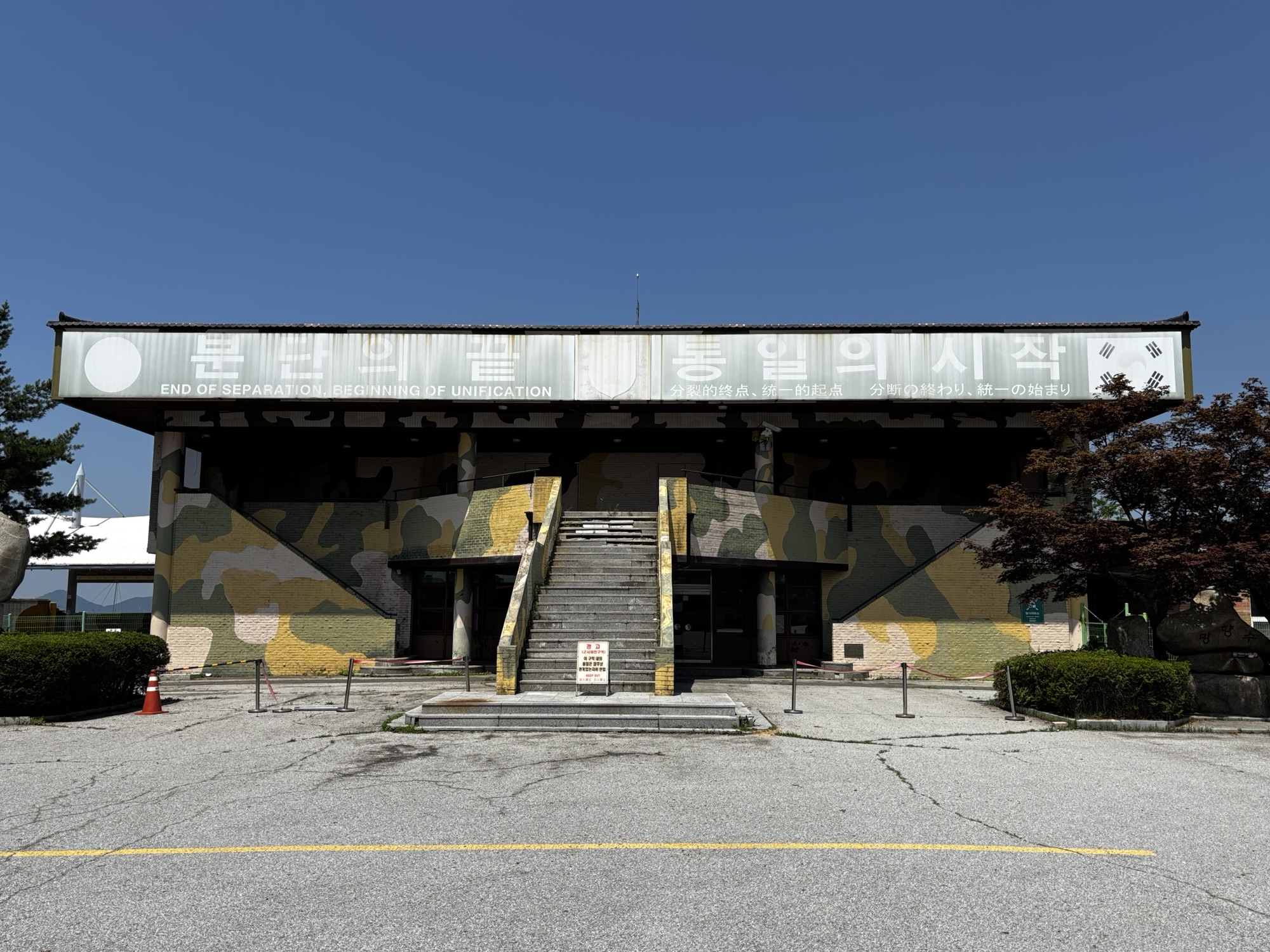 Po 1h20 drogi naszym autobusikiem dojeżdżajmy do pierwszego punku wycieczki. To miejsce przesiadkowe, gdzie zamienimy nasz busik na licencjonowany autobus, który może wjeżdzać do strefy. Jest to także miejsce pamięci pokazujące i objaśniające turystom sytuację polityczną między Koreą Północna i Koreą Południowa. Musicie wiedzieć, że oba państwa sa w stanie wojny, gdyż od 1953 trwa zimna wojna koreańska – z okresowymi ociepleniami, ale bez realnego zakończenia konfliktu.