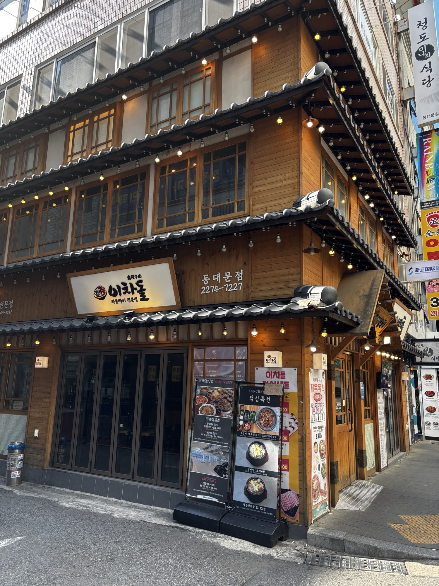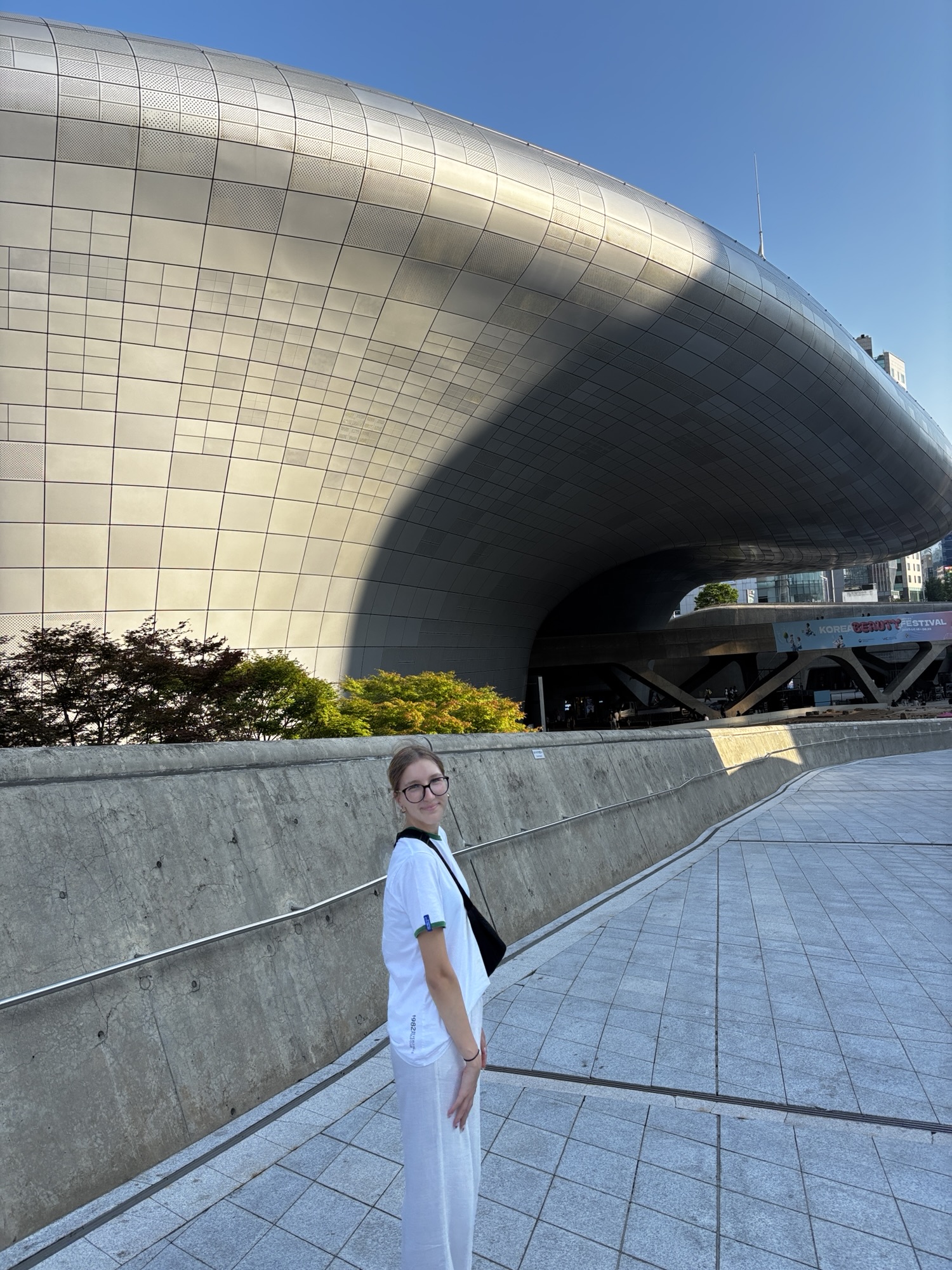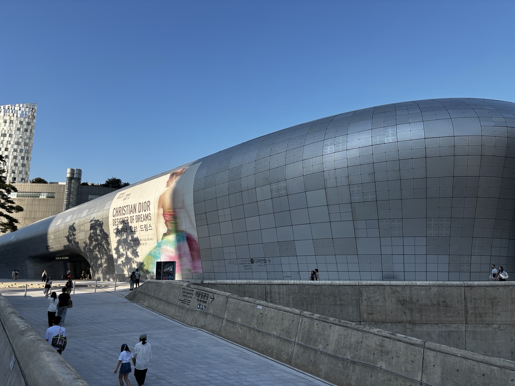 Zaraz obok restauracji mamy DDP czyli Dongdaemun Design Plaza. Jest to jedna z najbardziej futurystycznych budowli w Korei Południowej – prawdziwa perła nowoczesnej architektury i designu. Zaprojektowana przez legendarą architektkę Zahę Hadid, DDP została otwarta w 2014 roku i od razu stała się ikoną miasta. To nie tylko budynek – to żywe centrum designu, mody i technologii. Odbywają się tu wystawy sztuki nowoczesnej, pokazy mody (np. Seoul Fashion Week), targi designu, warsztaty VR, a nawet pokazy robotów.