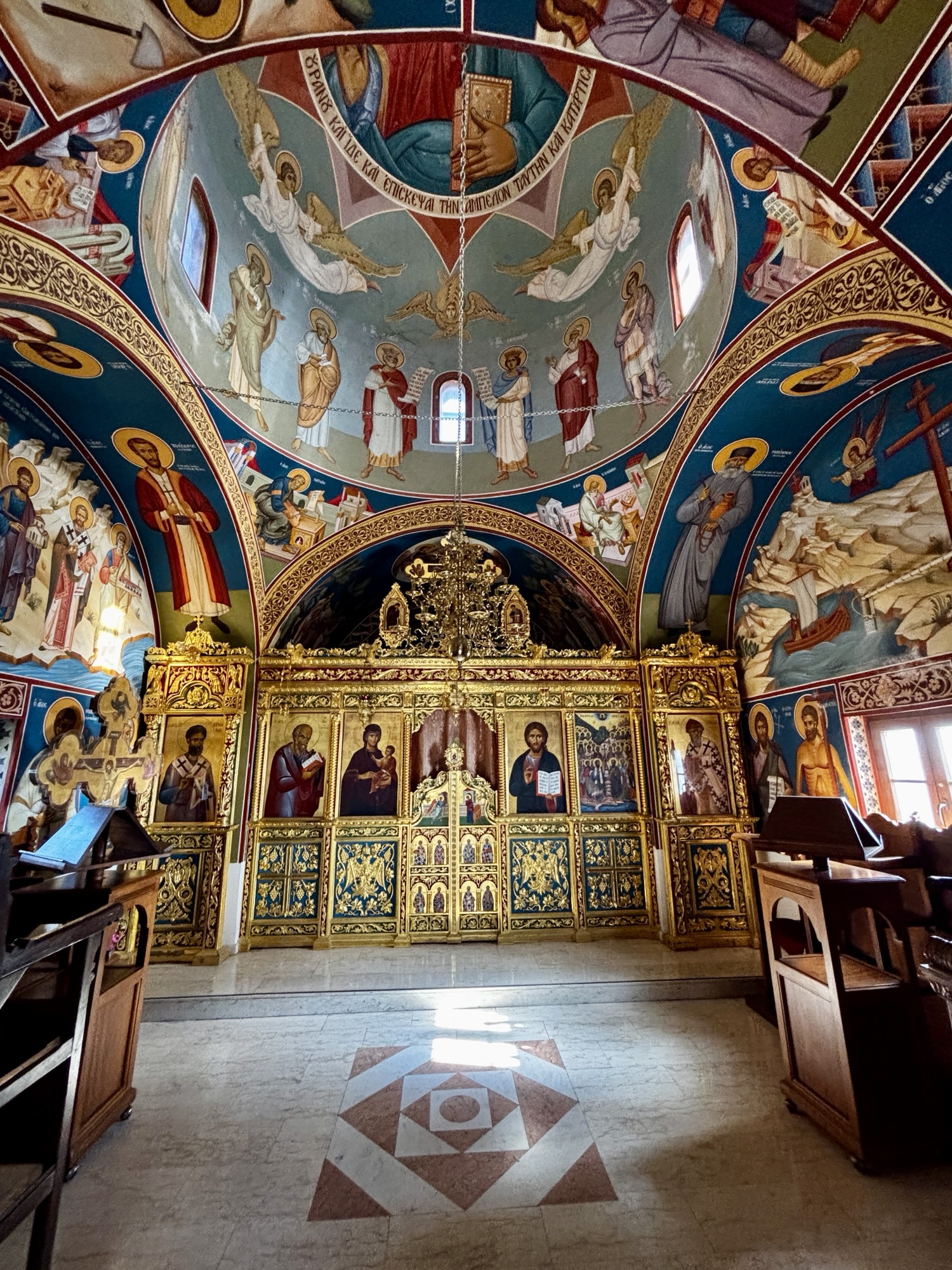 Przy parkingu widzimy także kaplicę Wszystkich Świętych Cypryjskich. Kaplica została poświęcona wszystkim świętym, którzy pochodzili z Cypru lub byli z nim związani, podkreślając wyjątkową rolę wyspy w historii chrześcijaństwa. Jej wnętrze zdobią ikony przedstawiające m.in. św. Barnabę Apostoła, św. Spirydona, św. Epifaniusza, a także wielu mniej znanych lokalnych świętych i męczenników.