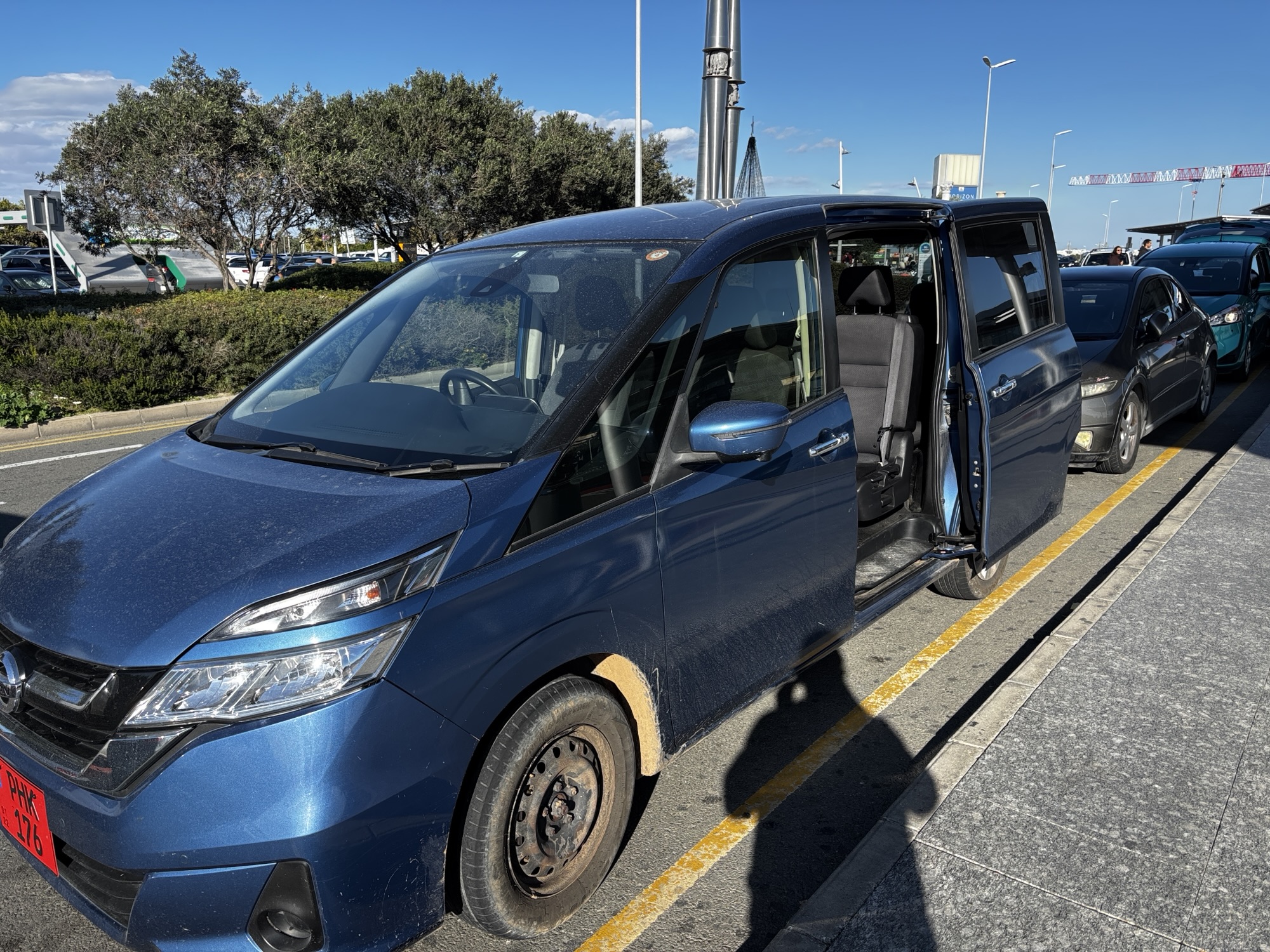 Chwilę czekamy na przedstawiciela wypożyczalni, który odbiera od nas Nissana Serenę, który dzielnie nam służył przez ostatnie dni. Mimo, że zarejestrowany jest na 8 osób to jak na standardy europejskie był trochę wąski. Ale w sumie nie pokonywaliśmy nim setek kilometrów a na wąskie uliczki Larnaki to ta jego szerokość była nawet na wagę złota. Ponadto jest dosyć pakowny z tyłu – mieścił nasze 8 walizek plus plecaki.