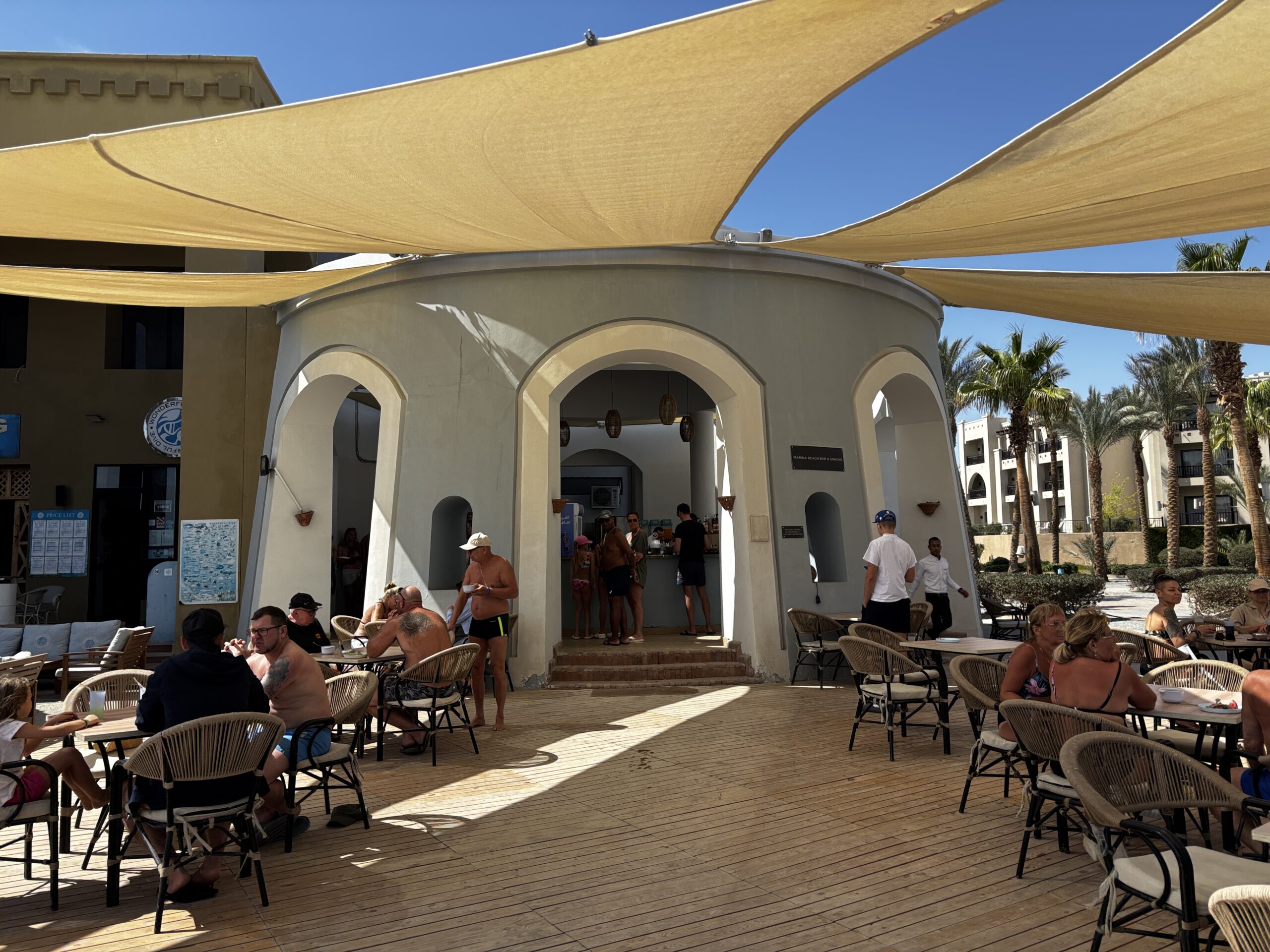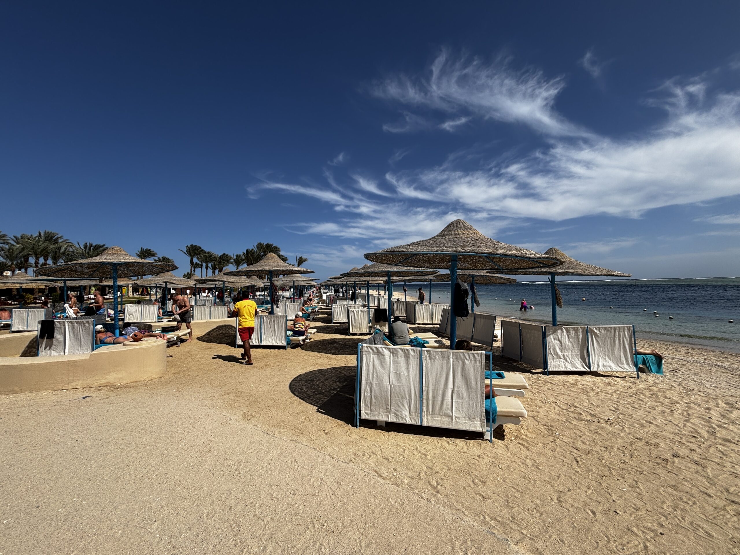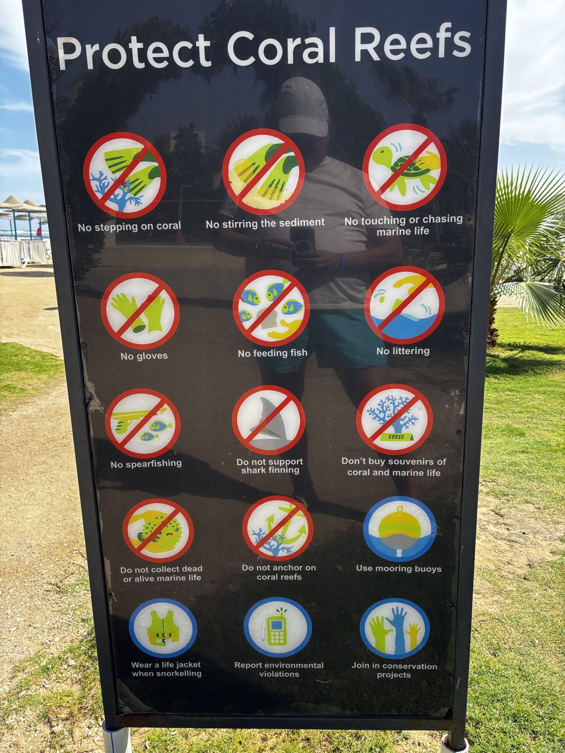 Tak po krotce o hotelowej plaży – zaraz na początku jest bar, gdzie serwują napoje, drinki i lunch od 12:30. Długość plaży to może ze 150m. Ona ciągnie się dalej, ale to już część innego hotelu. Na wejściu mamy tablicę informującą, że w morzu znajduje się rafa koralowa i sa także piktogramy co wolno a co nie wolno w związku z tym. Jest tu także boisko do siatkówki plażowej, kilka małych sklepików z pamiątkami (jakże oryginalnymi), punkt z ręcznikami plażowymi.