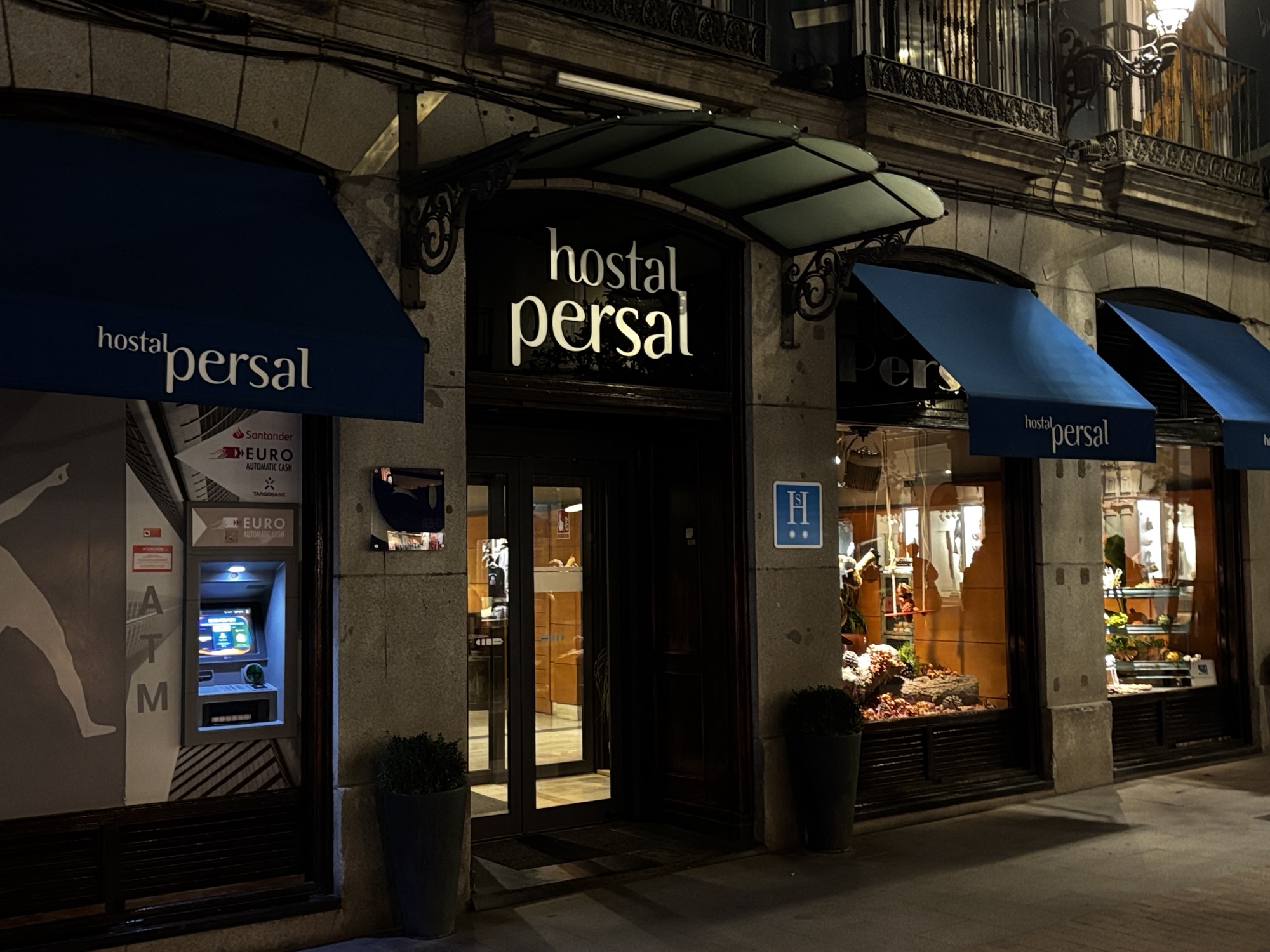 Samolot planowo podstawiony czeka na nas już na płycie lotniska. Startujemy planowo i zaraz skręcamy nad Krakowem i obieramy kierunek południowo-zachodni. Lot spokojny trwał prawie 3 godziny. Zaraz przed 20:00 gładko przyziemiamy na madryckim lotnisku, opuszczamy maszynę i kierujemy sie do wyjścia, gdzie miał czekać na nas kierowca mikrobusa. Niestety pisze do mnie, że ma opóźnienie i w sumie czekamy na niego ponad pół godziny. W końcu zabiera nas do hotelu w centrum Madrytu. Przejazd trwa niecałe 30 minut. Nasz hotel (nazywa sie Persal ) położony jest w samym centrum historycznego, starego miasta zaraz obok słynnego Puerta del Sol. Pokoje już na nas czekają, szybko zostawiamy nasze bagaże i meldujemy się wszyscy przed budynkiem na pełniącej życiem o tej porze madryckiej uliczce.