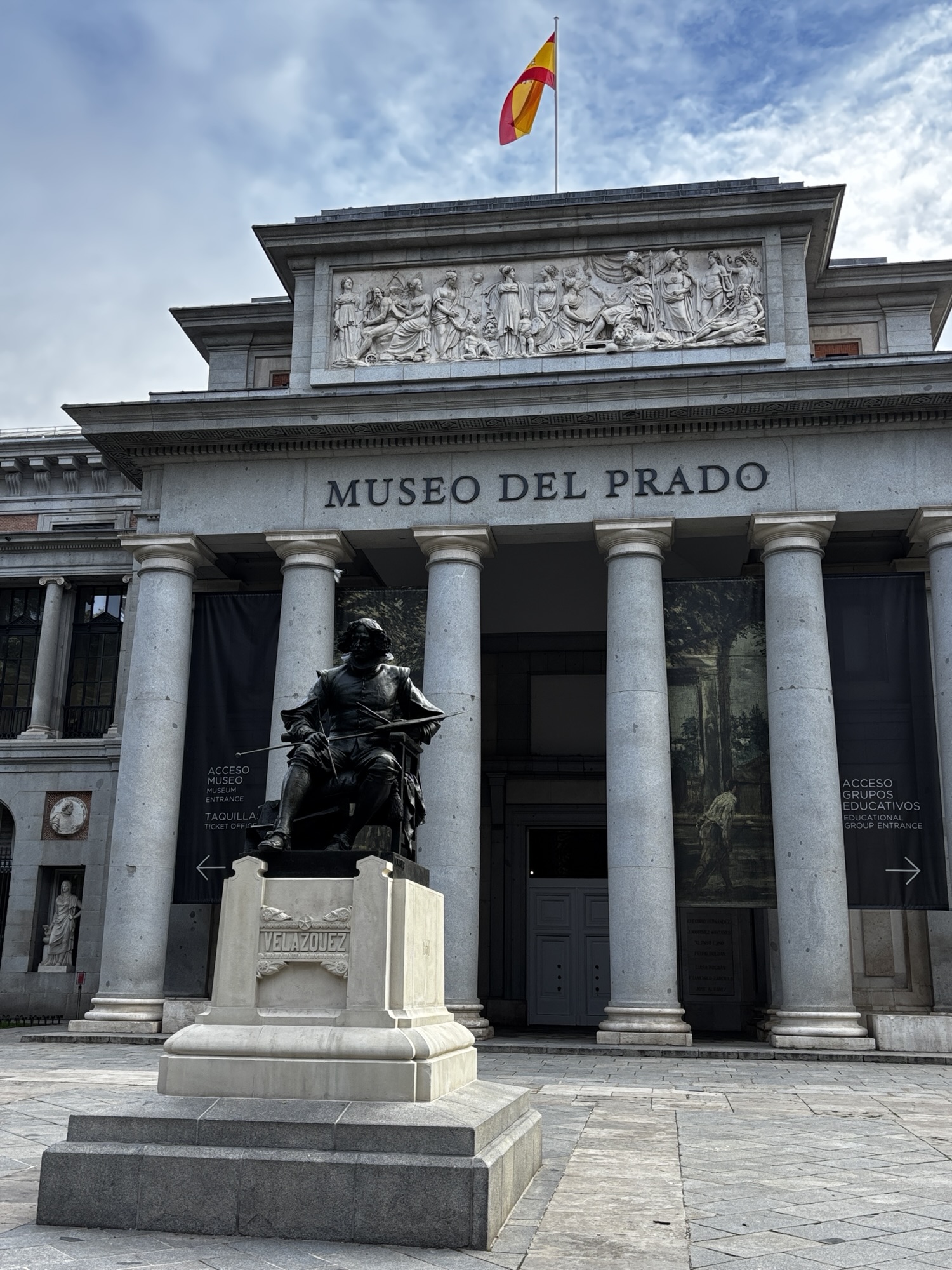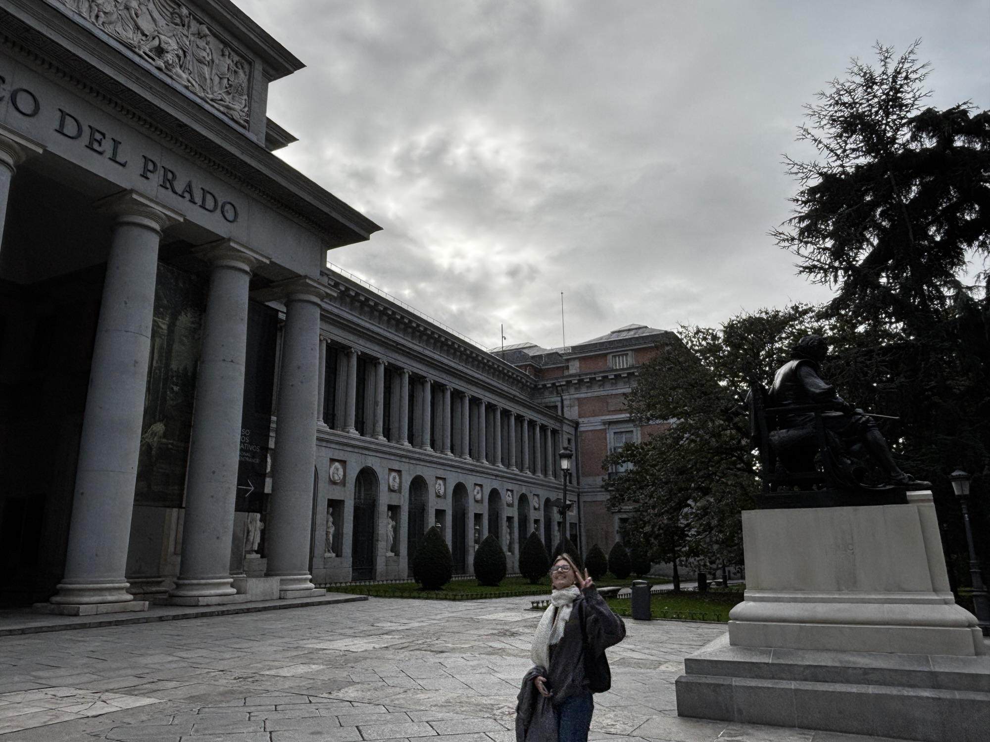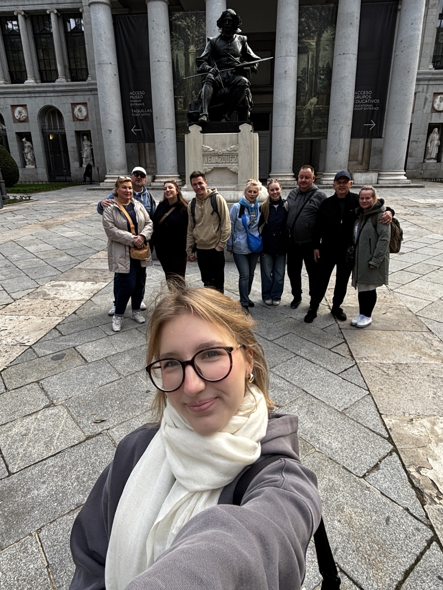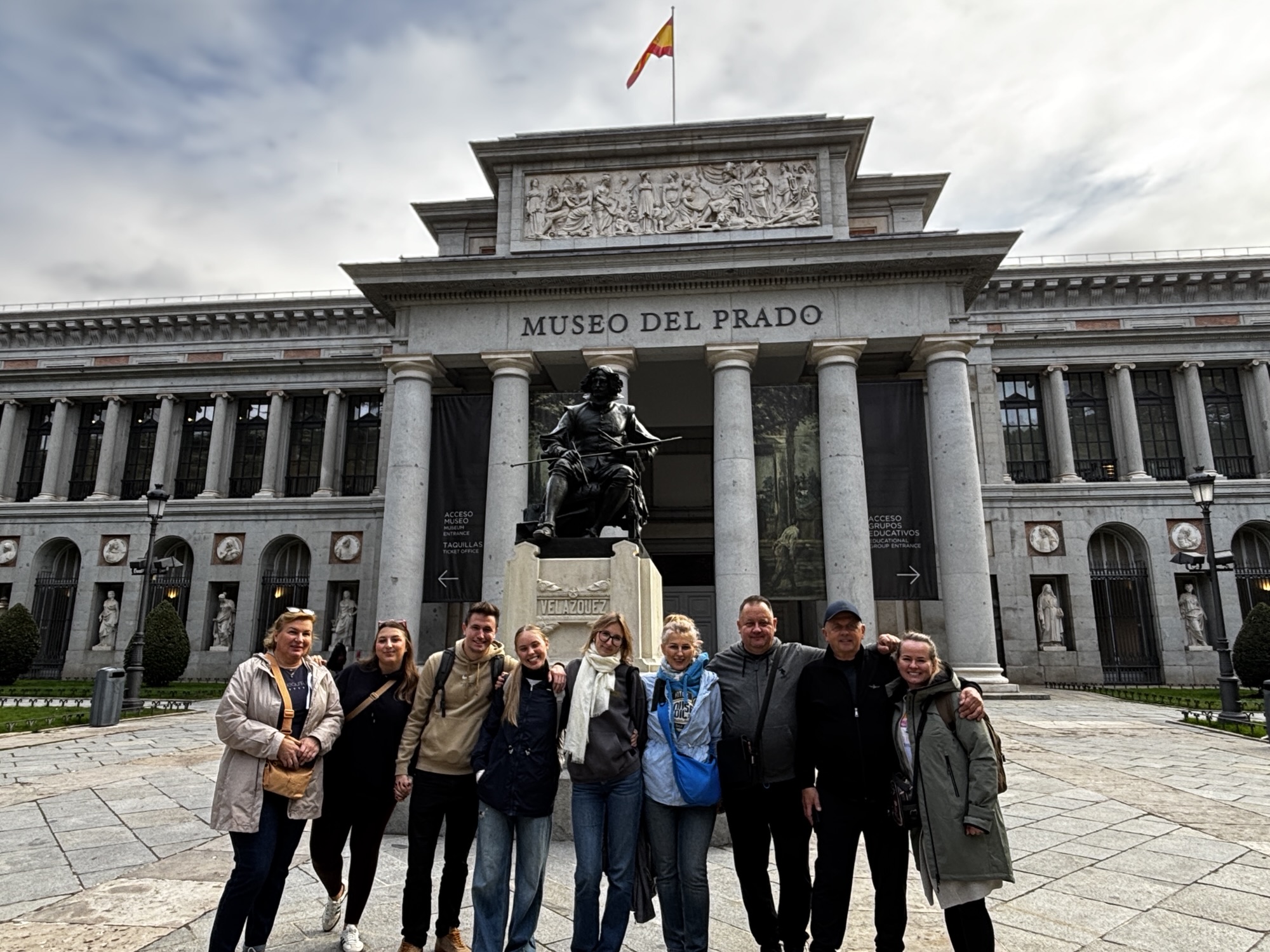 Asia jest nasza przewodniczką dzisiaj, gdyż przygotowała trasę wokół najbliższych atrakcji. Pierwsze kroki kierujemy na zachód – idziemy w kierunku muzeum Prado. To najsłynniejsze, hiszpańskie muzeum sztuki i także jedno z największych na świecie. Nie planujemy zwiedzania ekspozycji, gdyż mamy za mało czasu. Podziwiamy okazały budynek i pomnik Velázqueza przed nim.