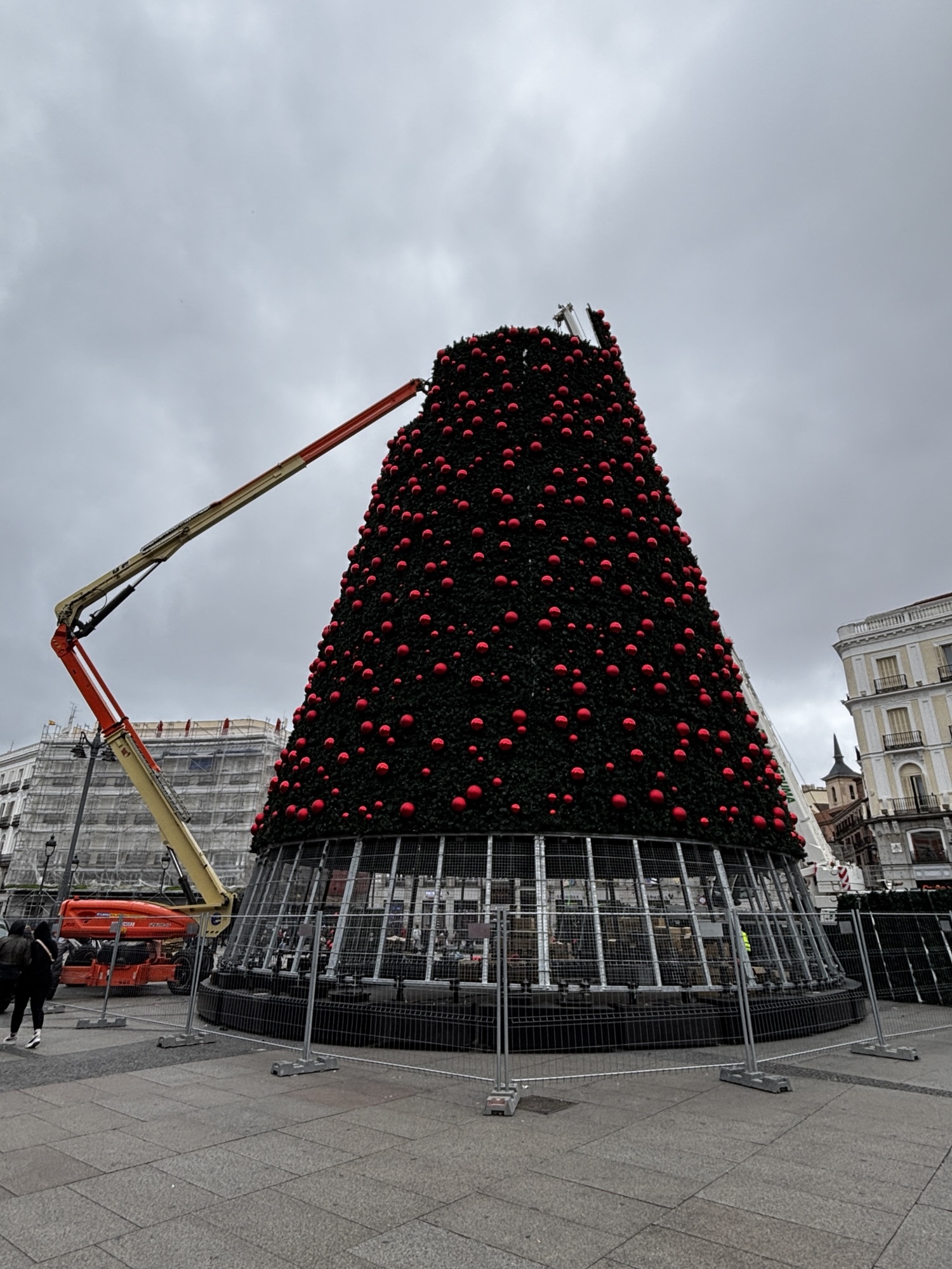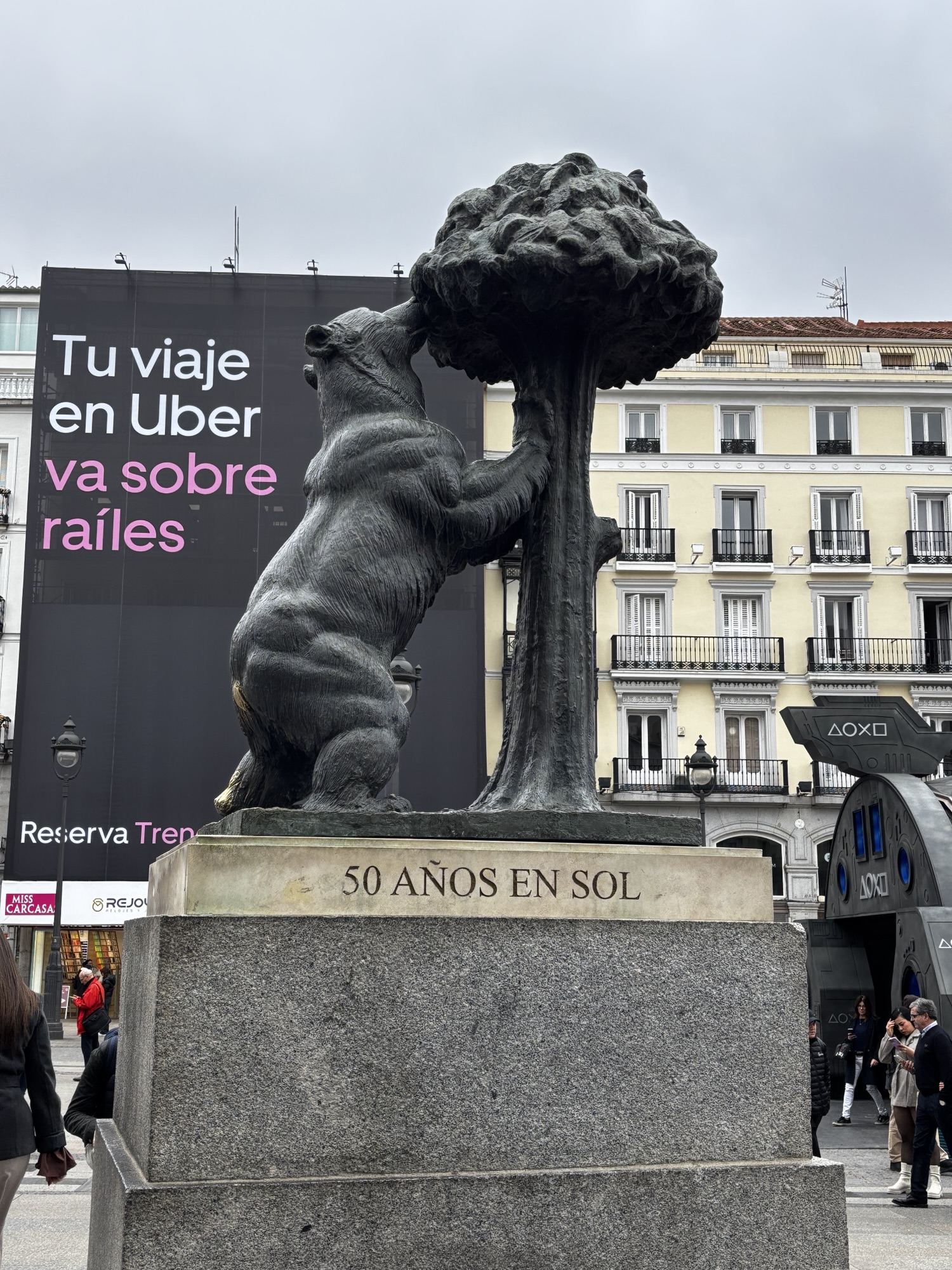 Dochodzimy do placu Sol, gdzie już przygotowania do świąt idą pełną parą. Jest tu także pomnik niedźwiedzia zjadającego poziomki z poziomkowego drzewa. Ja o takim nie słyszałem, ale ten niedźwiedź to symbol Madrytu.