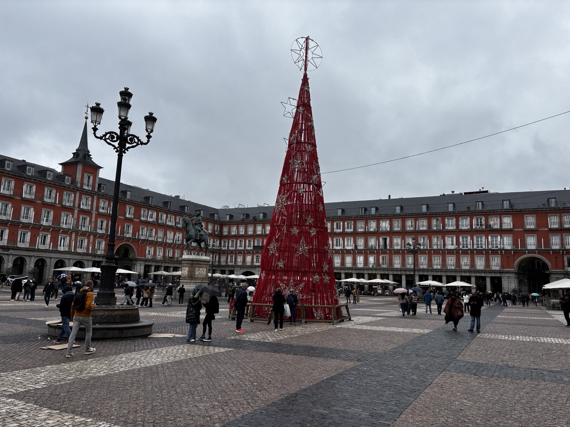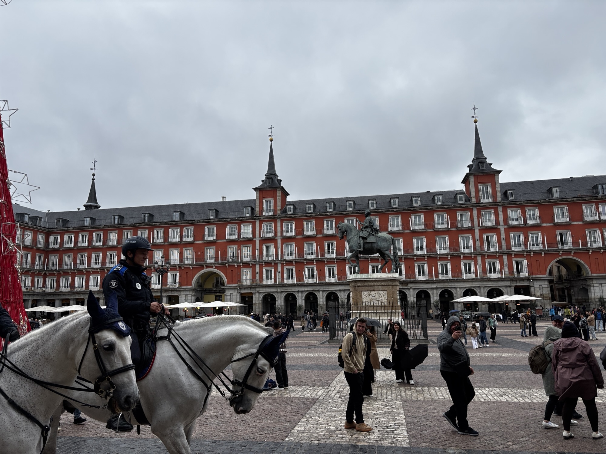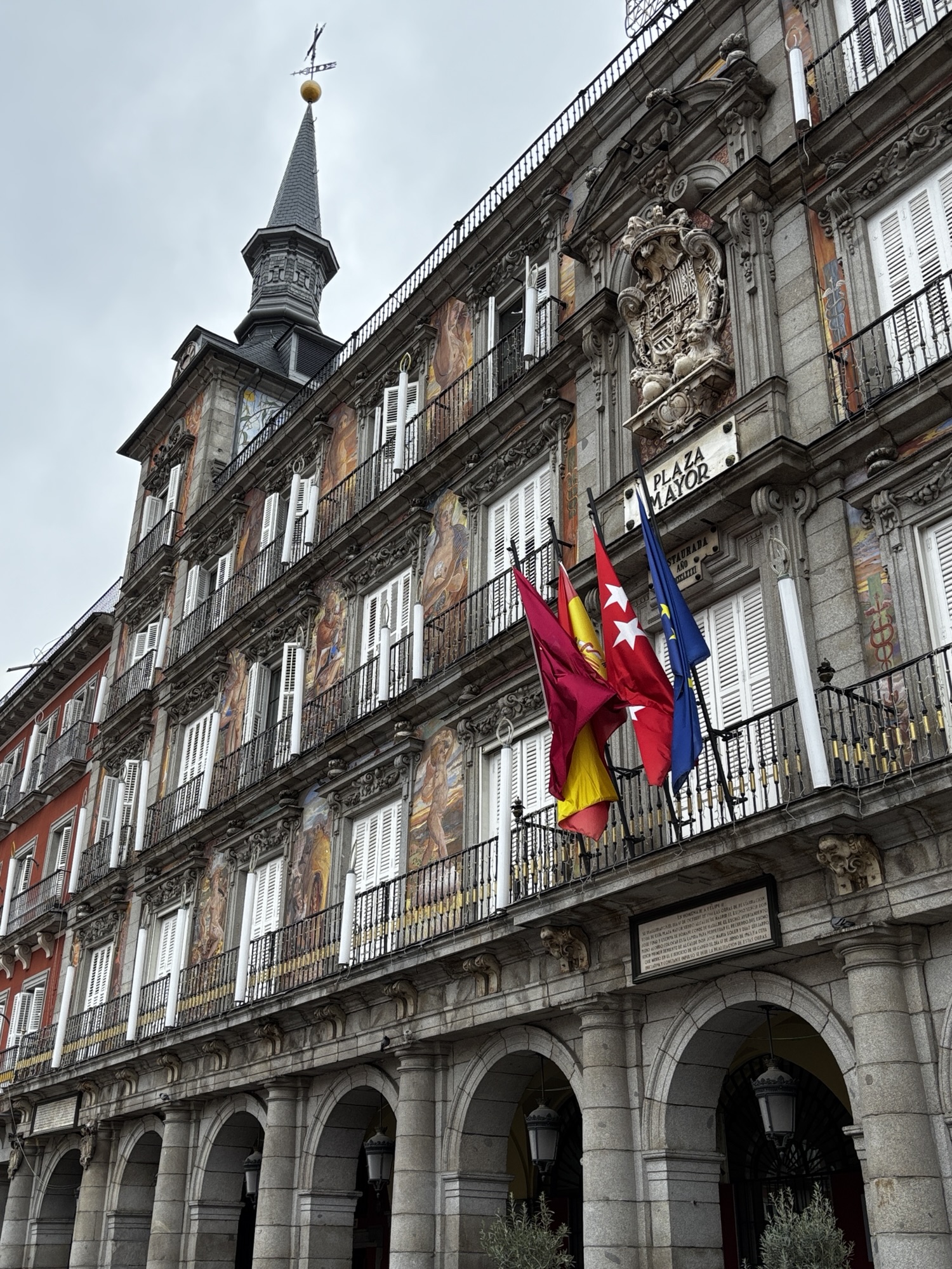 Zaczyna kropić. Przemieszczamy się w kierunku słynnego targu Mercado de San Miguel, gdzie chcemy sobie trochę podjeść lokalnych specjałów. Po drodze przechodzimy przez plac Mayor.