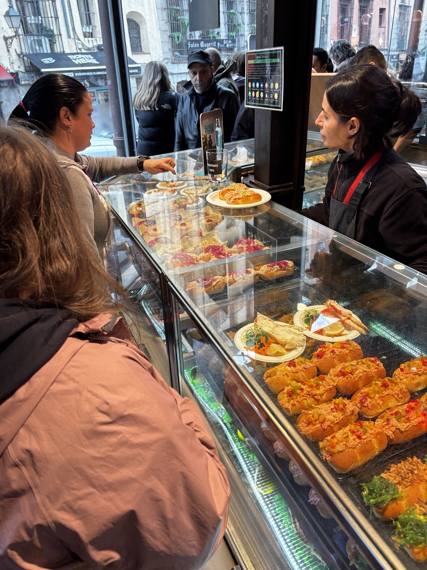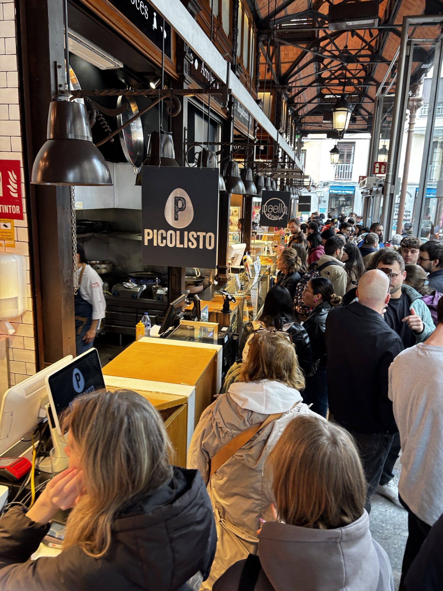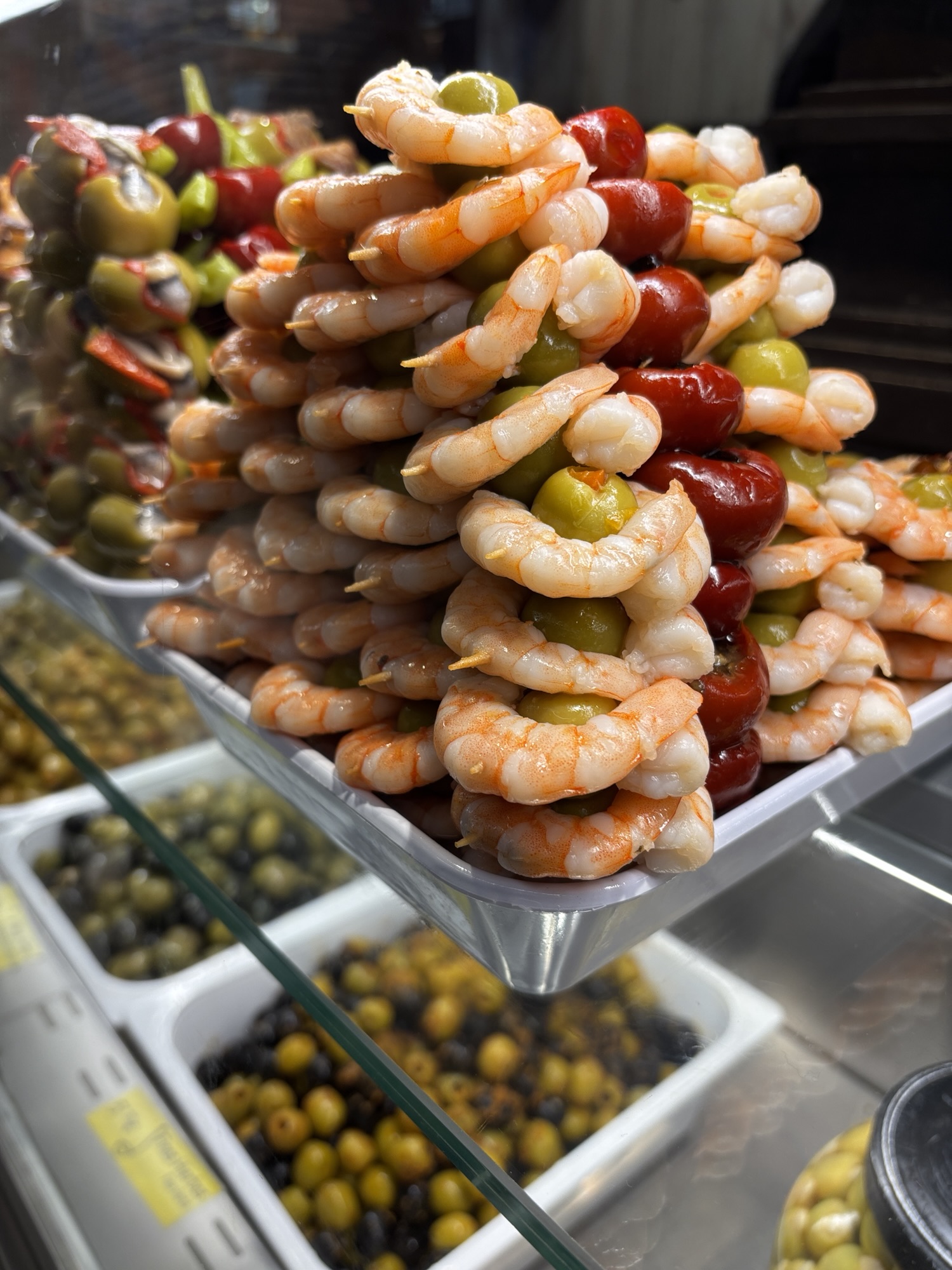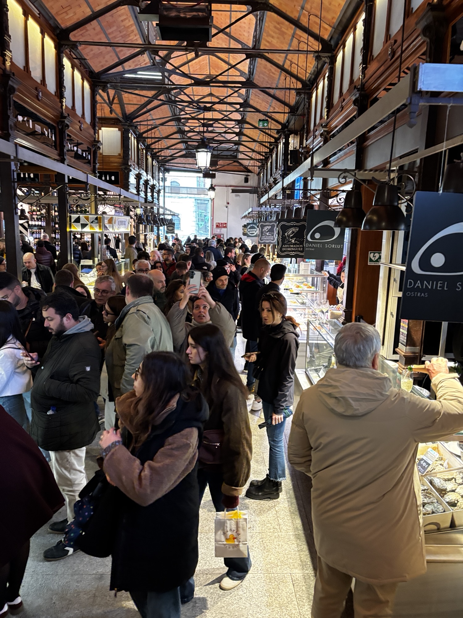 Budynek tego targu nie jest jakiś wielki i w sumie to nie jest targ w znaczeniu jakie znamy. Nie kupisz tu płodów rolnych czy innych rzeczy jakie u nas na targach dostaniesz. Tutaj to miejsce w którym dużo i pysznie zjesz. Jest to miejsce znane i lubiane przez miejscowych i turystów to i ciasno jest. Chodzimy tak sobie od sklepiku do sklepiku, które w tym wydaniu są punktami gastronomicznymi i kosztujemy lokalnych specjałów – tarasów, oliwek, szynek, owoców morza i churrosów. Wszystko super pyszne, ale czas lunchowy i padający deszcz sprawił, że tłok był spoty co utrudniało konsumpcję.