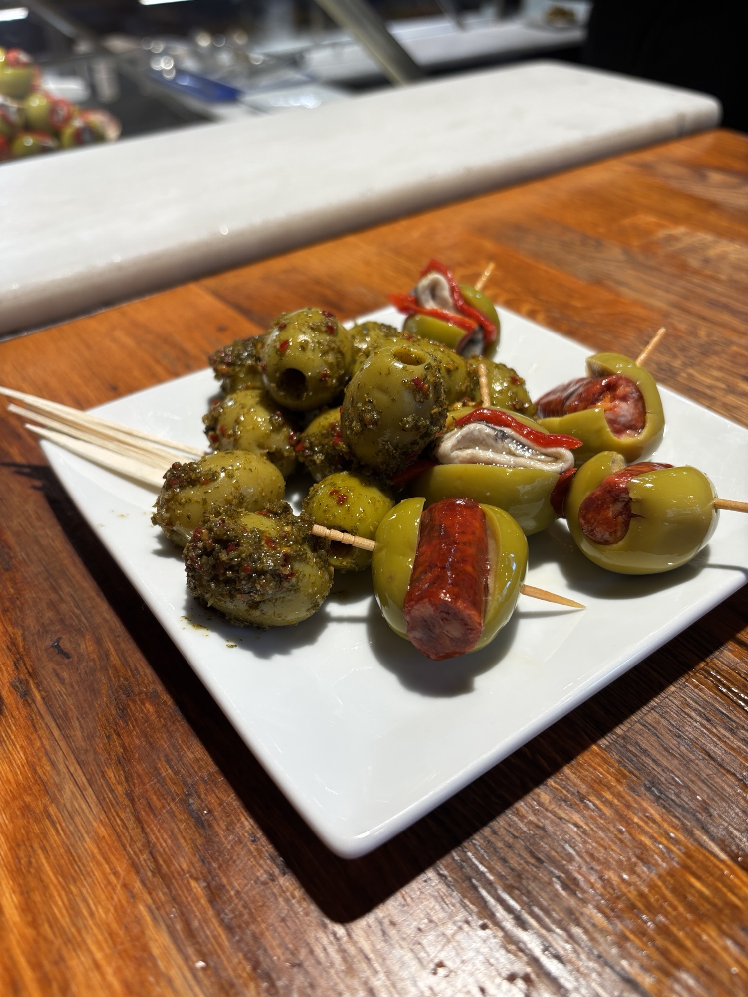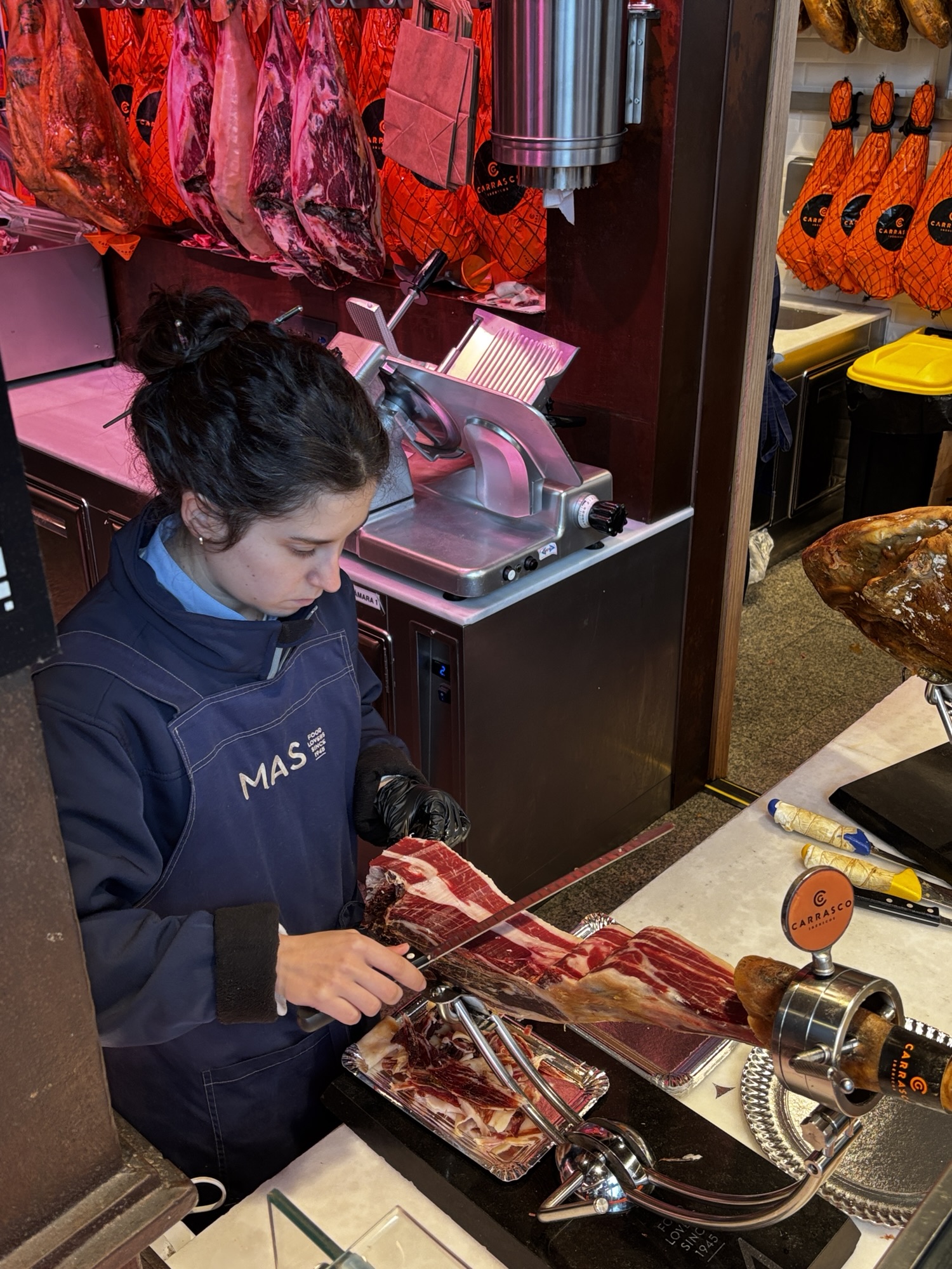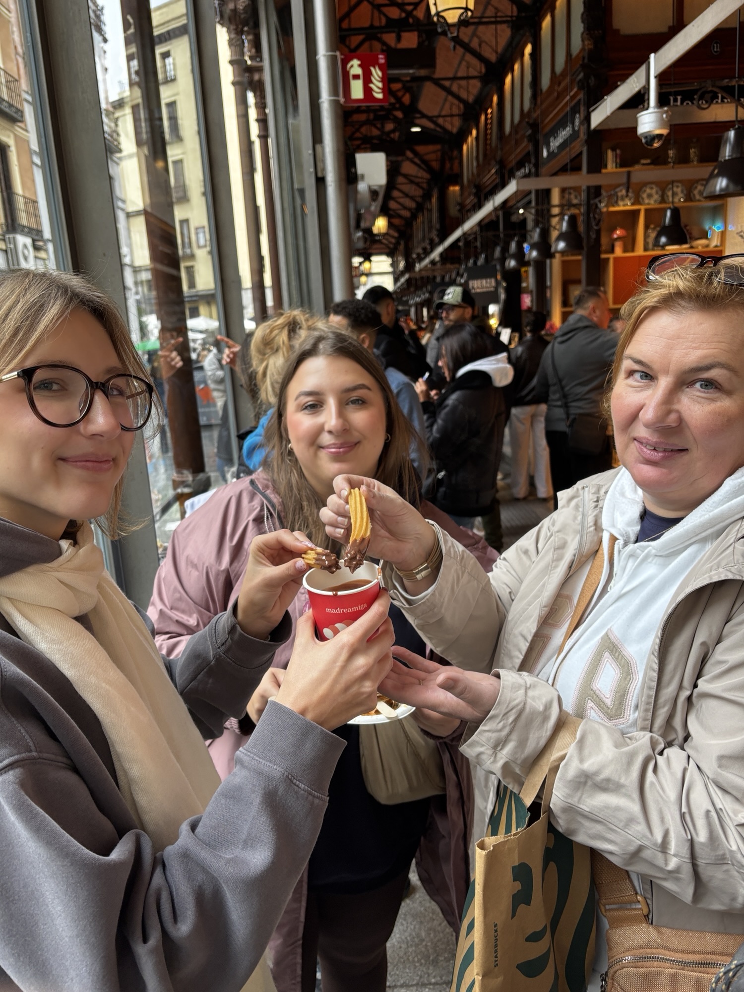 Budynek tego targu nie jest jakiś wielki i w sumie to nie jest targ w znaczeniu jakie znamy. Nie kupisz tu płodów rolnych czy innych rzeczy jakie u nas na targach dostaniesz. Tutaj to miejsce w którym dużo i pysznie zjesz. Jest to miejsce znane i lubiane przez miejscowych i turystów to i ciasno jest. Chodzimy tak sobie od sklepiku do sklepiku, które w tym wydaniu są punktami gastronomicznymi i kosztujemy lokalnych specjałów – tarasów, oliwek, szynek, owoców morza i churrosów. Wszystko super pyszne, ale czas lunchowy i padający deszcz sprawił, że tłok był spoty co utrudniało konsumpcję.