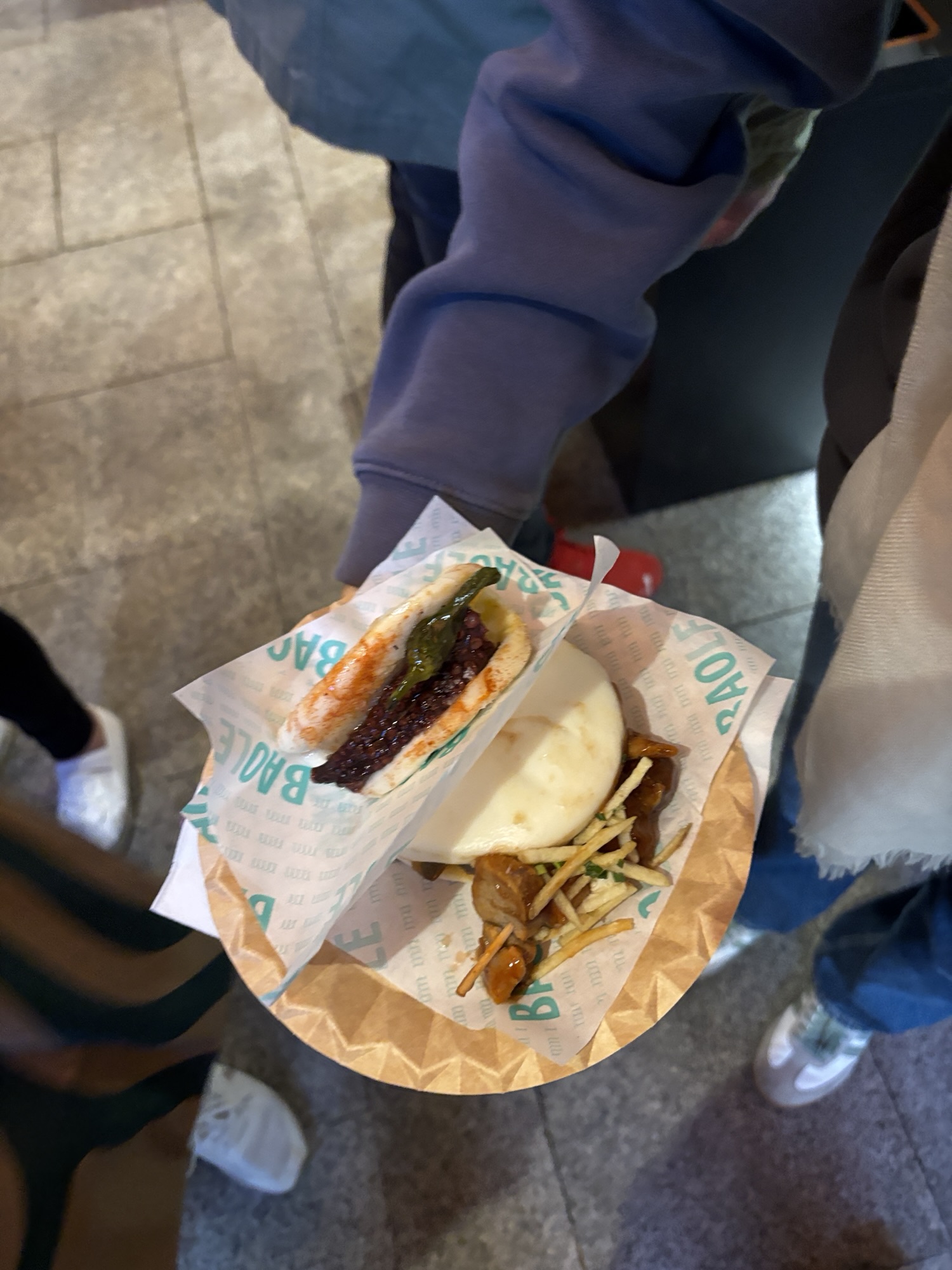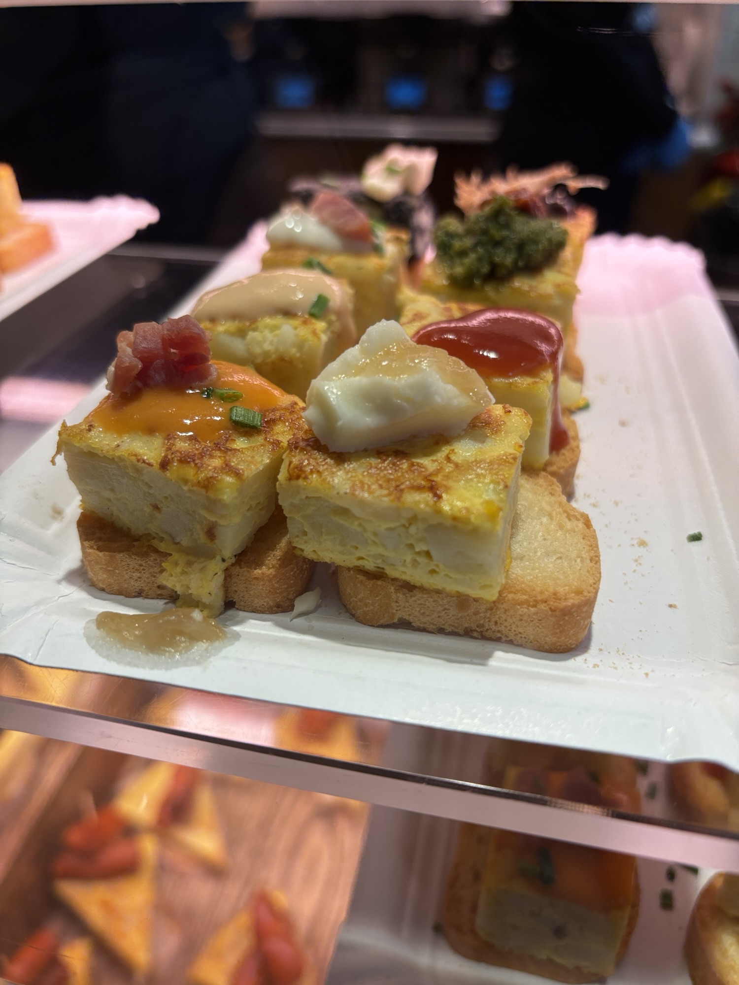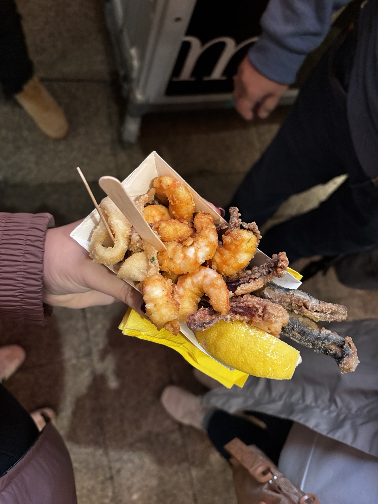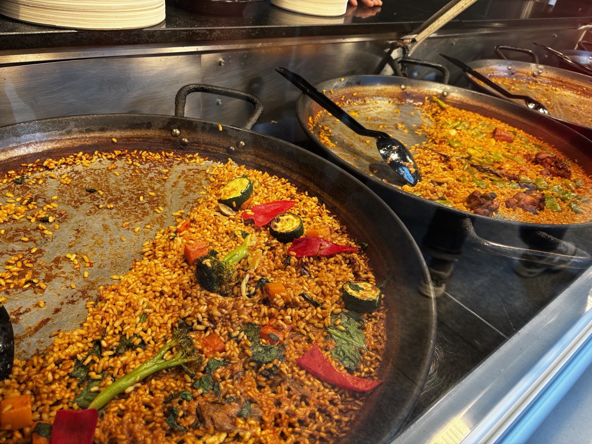 Budynek tego targu nie jest jakiś wielki i w sumie to nie jest targ w znaczeniu jakie znamy. Nie kupisz tu płodów rolnych czy innych rzeczy jakie u nas na targach dostaniesz. Tutaj to miejsce w którym dużo i pysznie zjesz. Jest to miejsce znane i lubiane przez miejscowych i turystów to i ciasno jest. Chodzimy tak sobie od sklepiku do sklepiku, które w tym wydaniu są punktami gastronomicznymi i kosztujemy lokalnych specjałów – tarasów, oliwek, szynek, owoców morza i churrosów. Wszystko super pyszne, ale czas lunchowy i padający deszcz sprawił, że tłok był spoty co utrudniało konsumpcję.