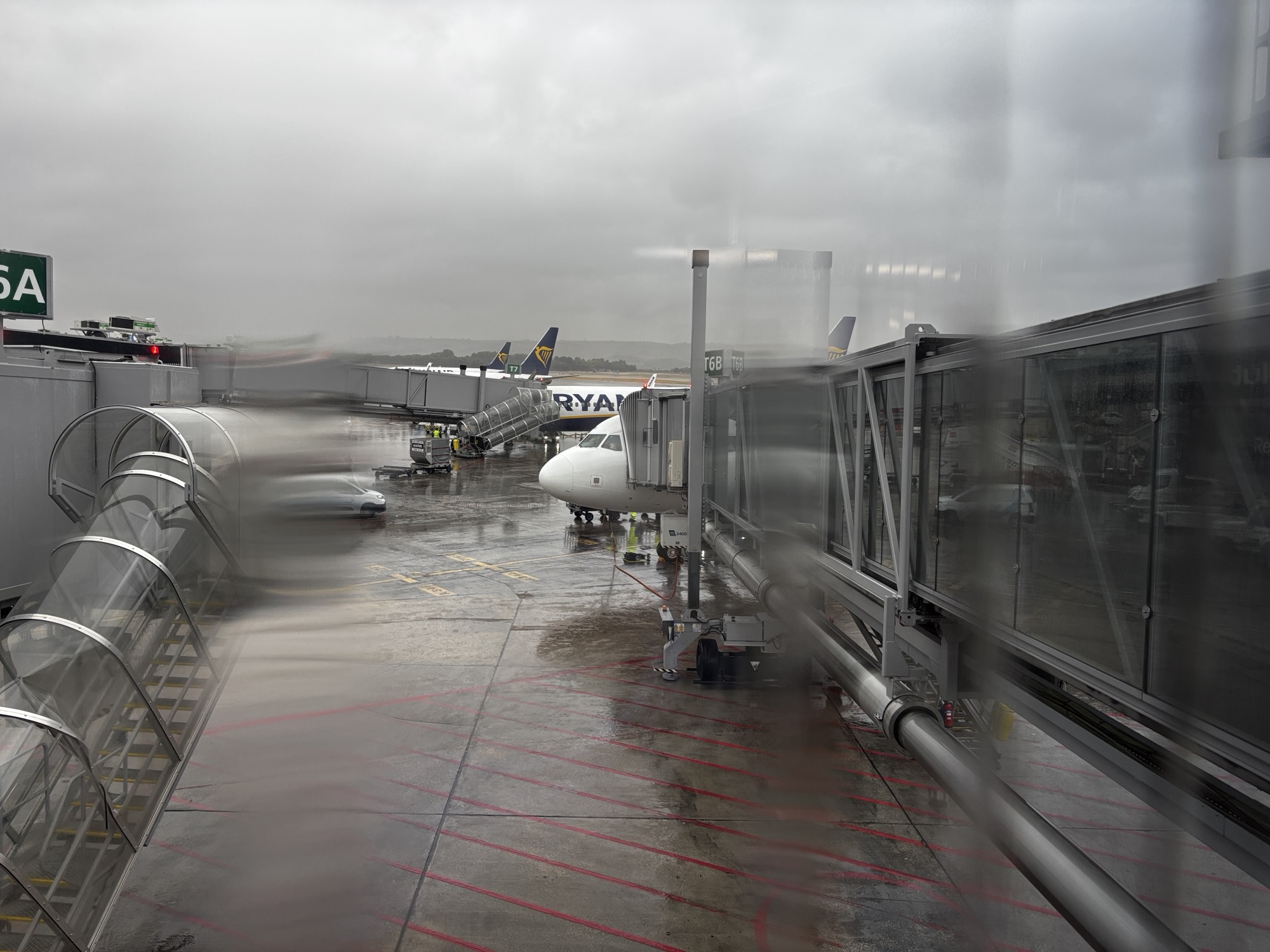 Nigdy nie lecieliśmy tymi liniami. Boarding sprawny w dwóch grupach. Najpierw wchodzą pasażerowie z rzędów 16-32, później 1-15. Wnętrze wygląda dużo lepiej niż wczorajszy Ryanair. Siedzenia sa szersze i materiałowe jednak miejsca na nogi jest chyba tyle samo czyli mało. Samolot pełniutki ale nie startuje o czasie. Kapitan informuje, że mamy opóźnione tankowanie co spowoduje 20 minutowe opóźnienie. Potem dodaje, że pogoda (ciagle pada deszcz i opadła mgła) spowodowała większą kolejkę do startu i to pogłębi nasze opóźnienie. W sumie startujemy 40 minut później niż plan był.