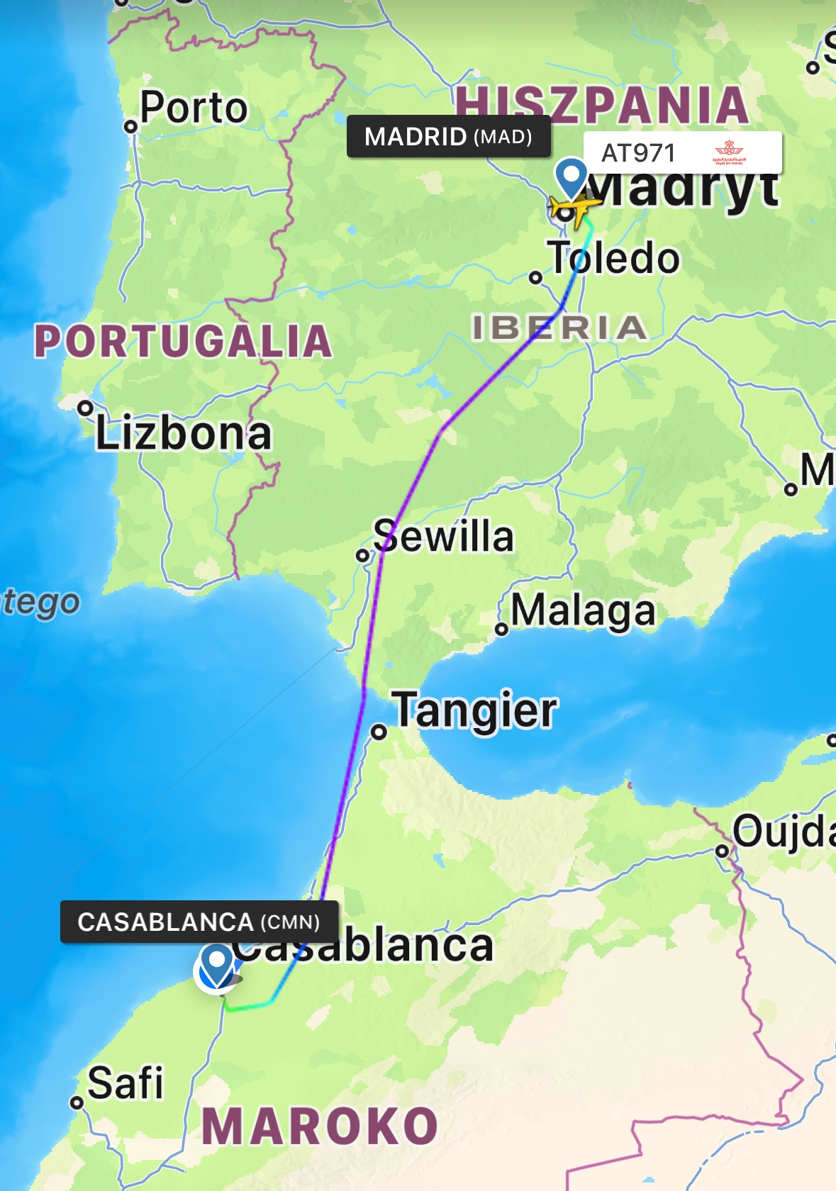 Lot był spokojny i trwał 80 minut. Co ciekawe, mieliśmy w samolocie podwieszone ekraniki i podczas lotu leciały kreskówki typu „Struś Pędziwiatr” – zabawne. Bezpiecznie i komfortowo lądujemy na lotnisku w Casablance.